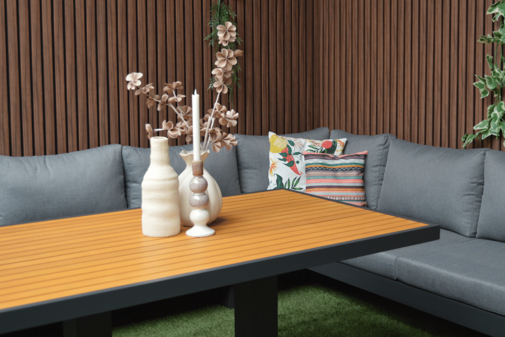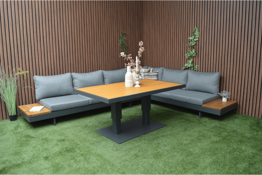 Zoek je een luxe hoekbank voor het hele gezin? De Loungeset Monte Carlo hoekbank met verstelbare tafel tuinset 6-persoons Aluminium/Hout is ontworpen voor iedereen die zijn buitenruimte wil transformeren tot een stijlvolle en comfortabele leefplek. Deze royale 4-delige set biedt plaats aan zes personen en heeft dezelfde ruime opstelling als de populaire varianten, maar onderscheidt zich door de praktische, in hoogte verstelbare tafel.