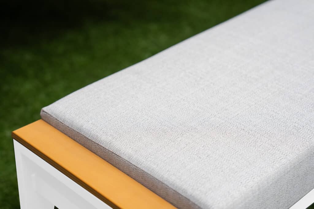 Het dikke zitkussen van maar liefst 12cm zorgt voor heerlijk zitcomfort. De grijze polyester bekleding past mooi bij het mat witte frame en het warme hout. Met een zithoogte van 42cm en een diepte van 40cm zit je ontspannen en kun je echt genieten van zomerse momenten buiten. Het gepoedercoate aluminium frame is licht, roestvrij en kan het hele jaar buiten blijven staan. Een sopje is voldoende om het bankje schoon te houden.