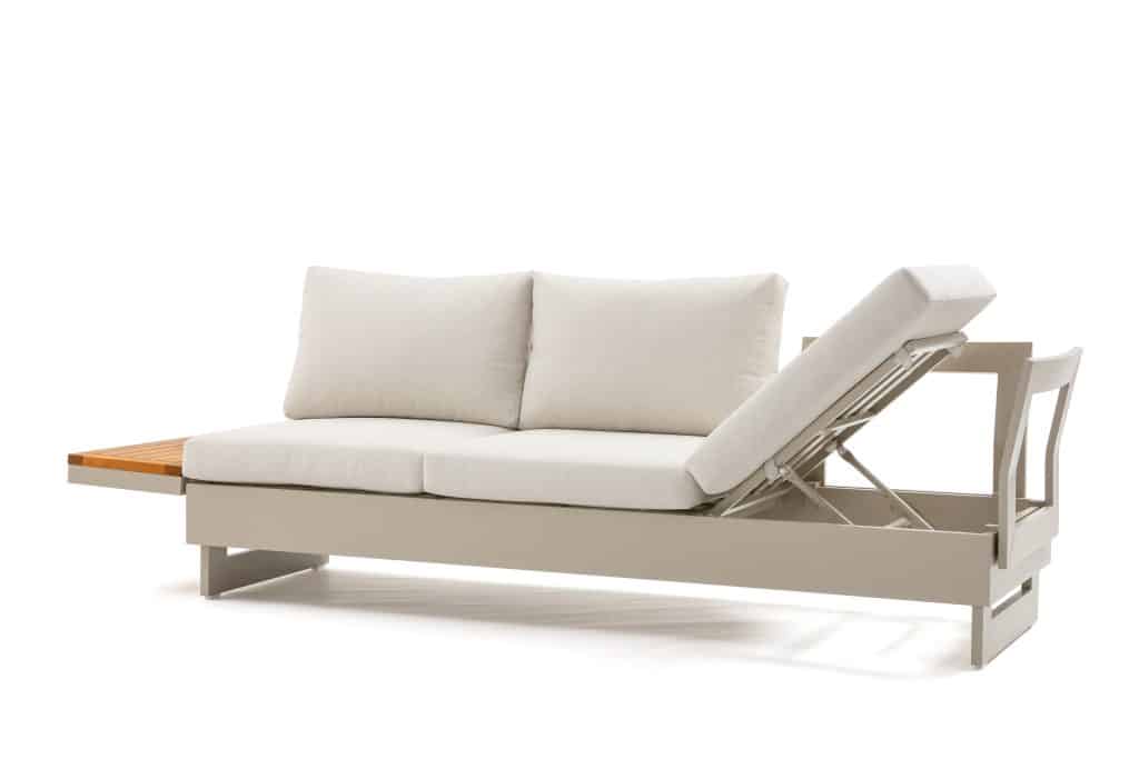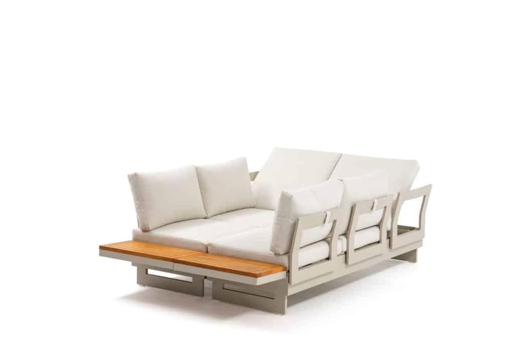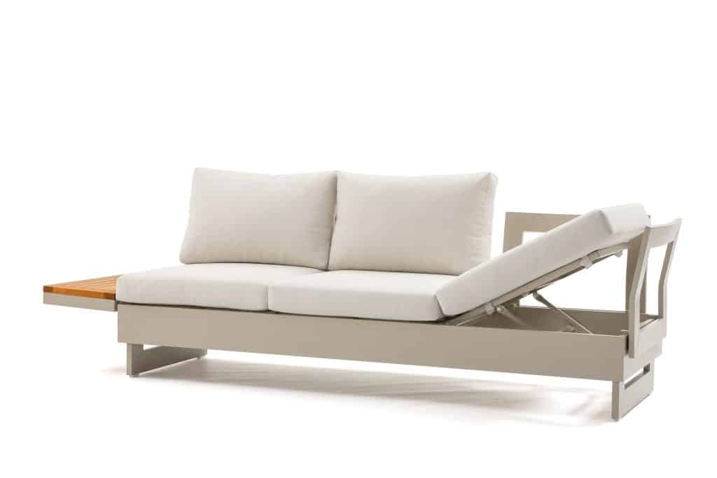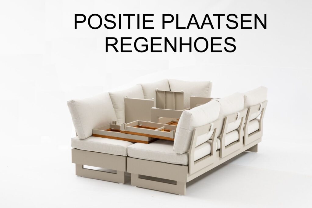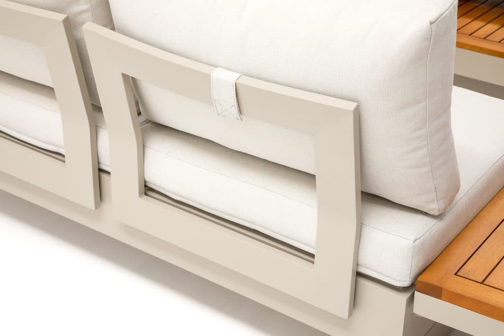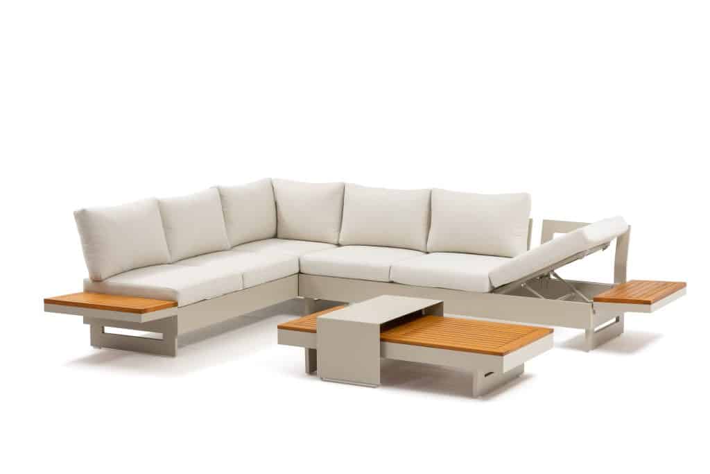 De rugleuningen en houten plateaus zijn volledig rondom de banken te plaatsen. Hierdoor creëer je diverse opstellingen zoals een hoekbank, twee losse banken of een comfortabel ligbed. De buitenste zitplekken zijn in hoogte verstelbaar, ideaal om heerlijk te liggen met een boek. De dikke zitkussens van maar liefst 12cm zijn volledig waterafstotend en gemaakt van een comfortabele Olefin All-Weather stof. Met een zithoogte van 42cm zit je perfect ontspannen. De kussens zijn afritsbaar en wasbaar voor eenvoudig onderhoud. De set is vergelijkbaar aan de populaire Barbados beige loungeset en wordt al jarenlang zeer succesvol verkocht.