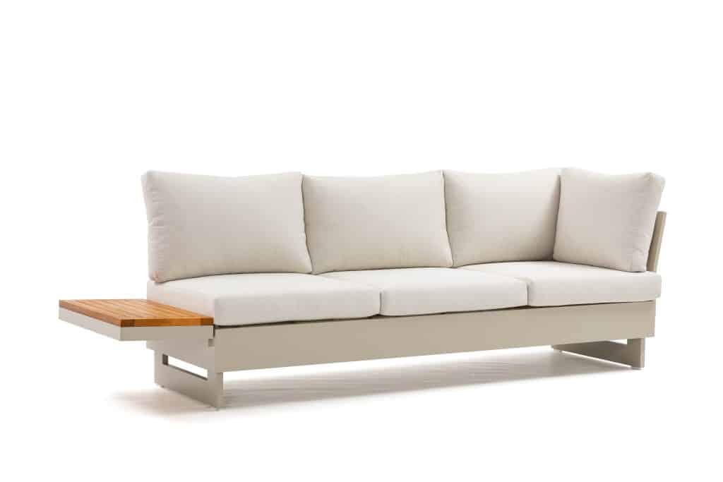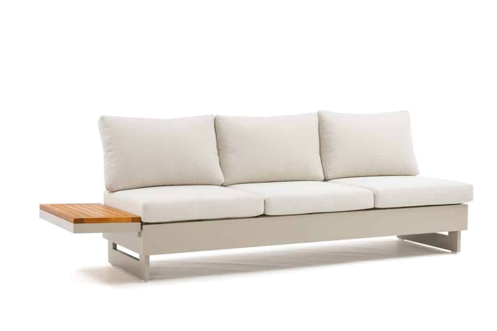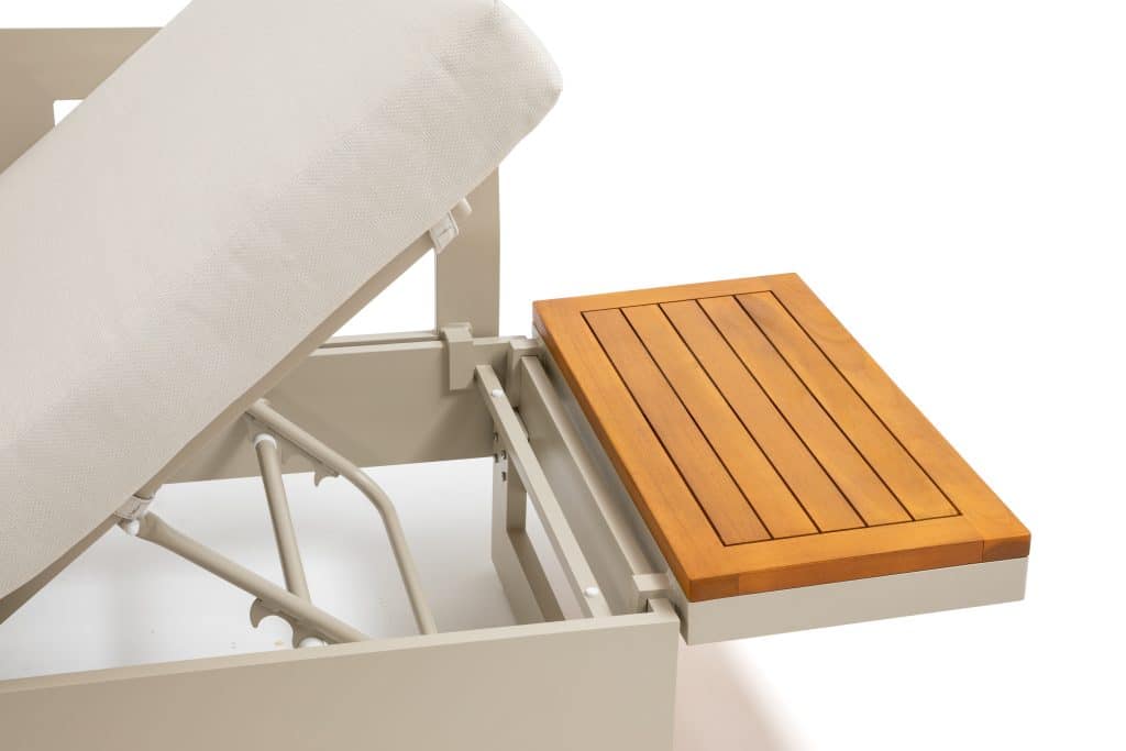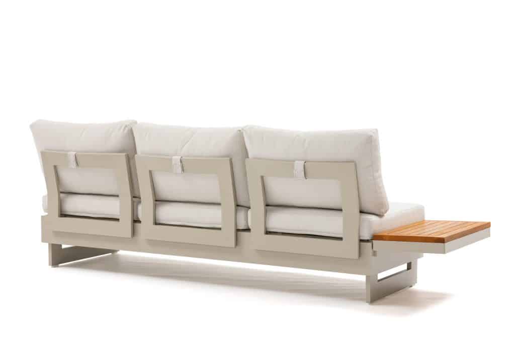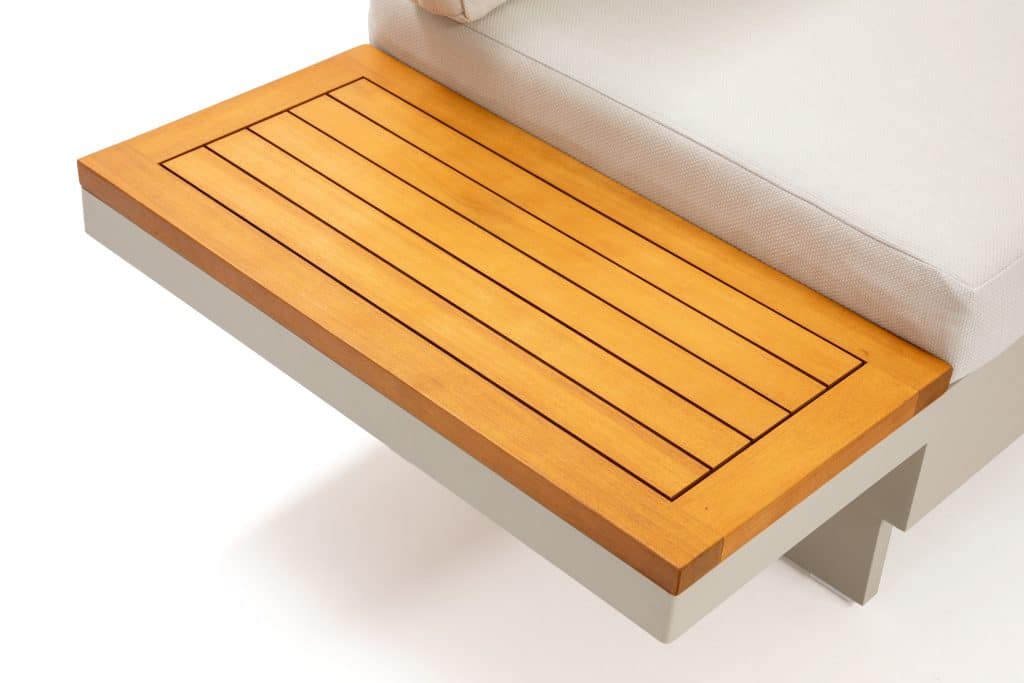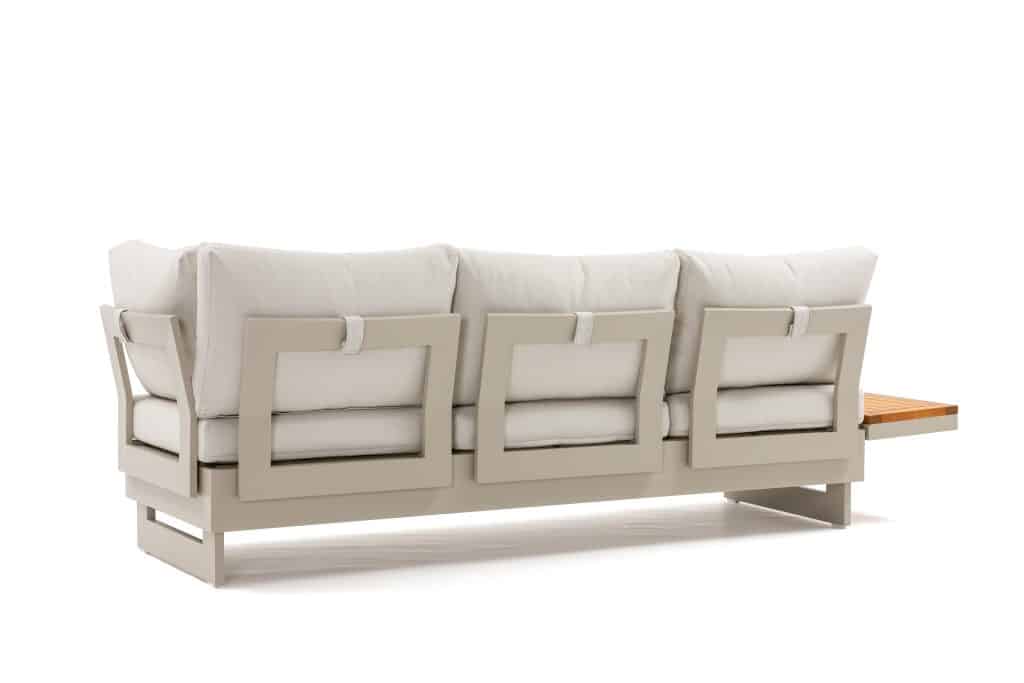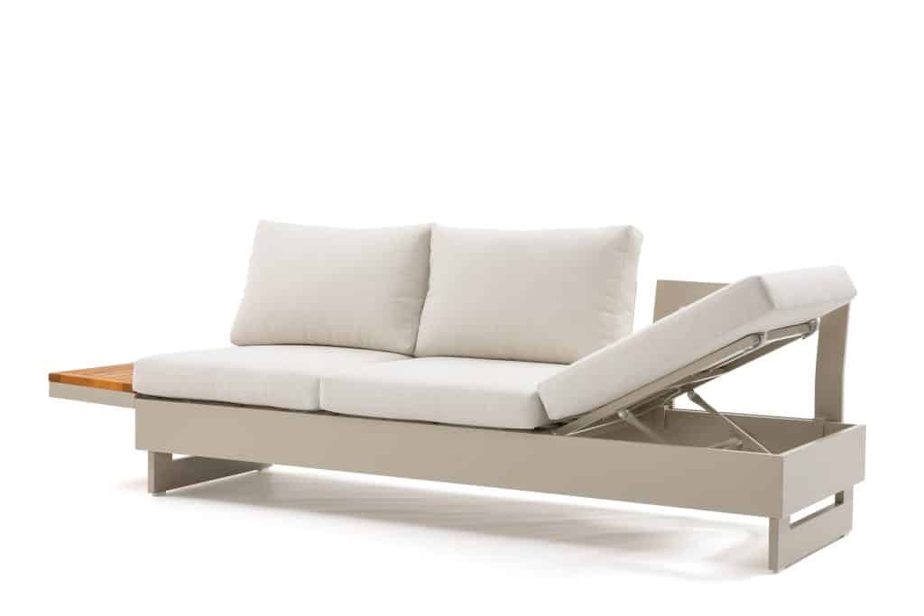 De rugleuningen en houten plateaus zijn volledig rondom de banken te plaatsen. Hierdoor creëer je diverse opstellingen zoals een hoekbank, twee losse banken of een comfortabel ligbed. De buitenste zitplekken zijn in hoogte verstelbaar, ideaal om heerlijk te liggen met een boek. De dikke zitkussens van maar liefst 12cm zijn volledig waterafstotend en gemaakt van een comfortabele Olefin All-Weather stof. Met een zithoogte van 42cm zit je perfect ontspannen. De kussens zijn afritsbaar en wasbaar voor eenvoudig onderhoud. De set is vergelijkbaar aan de populaire Barbados beige loungeset en wordt al jarenlang zeer succesvol verkocht.