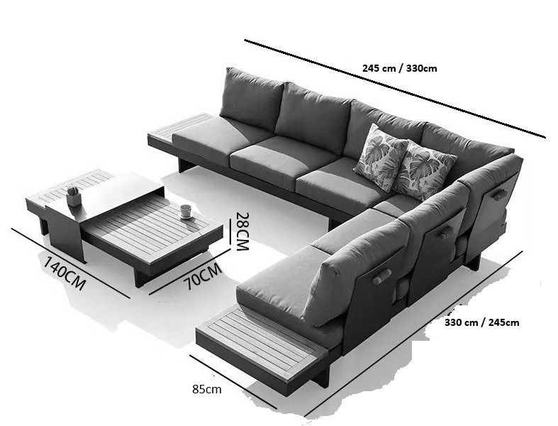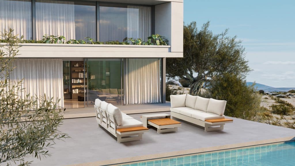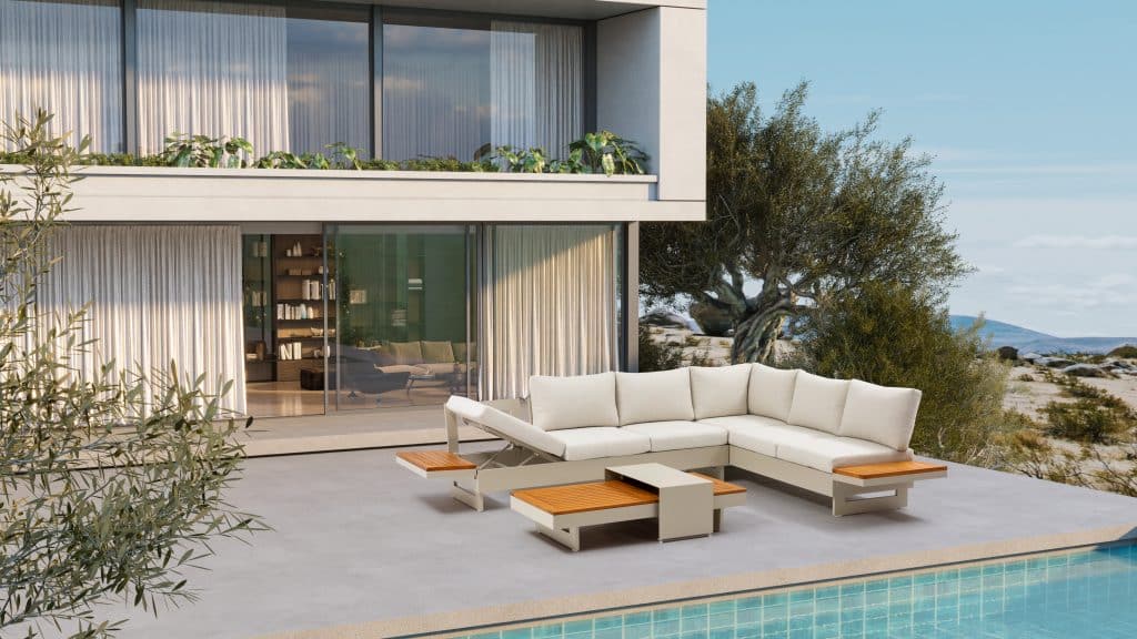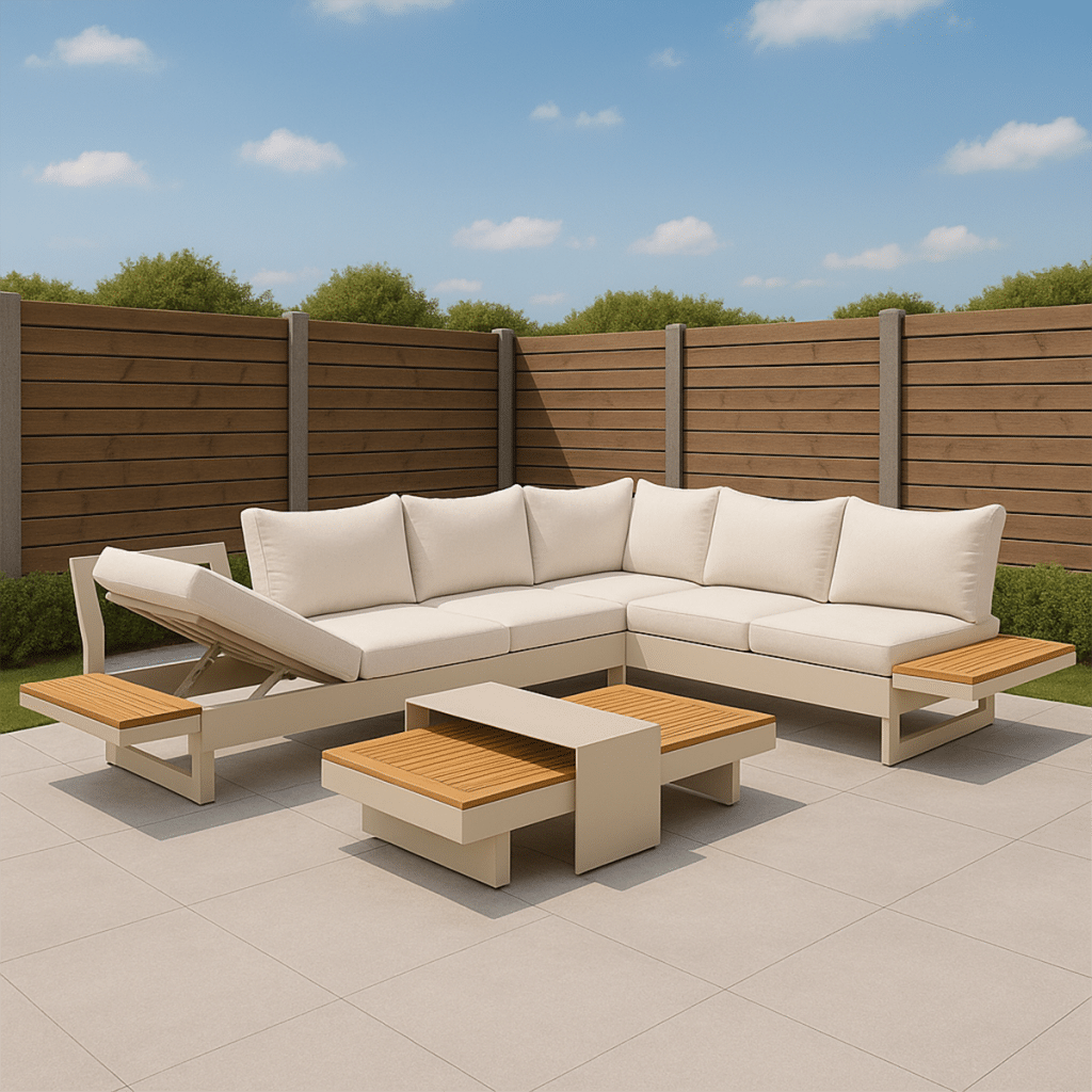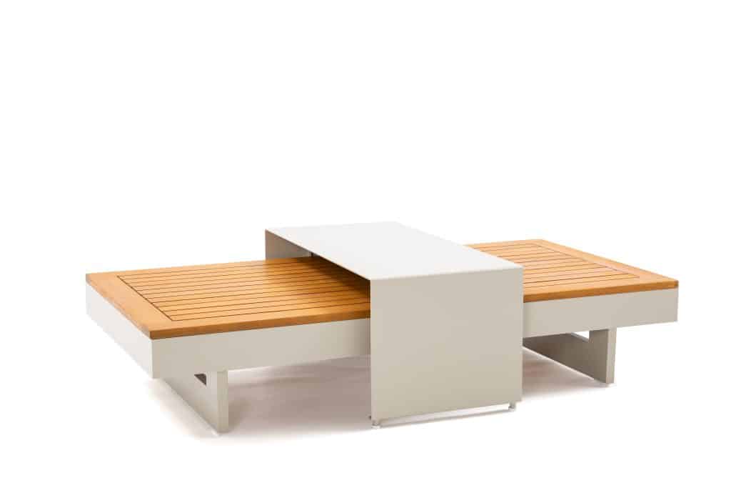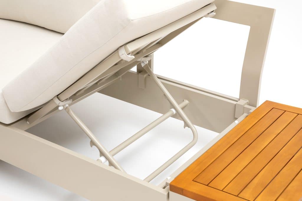 De rugleuningen en houten plateaus zijn volledig rondom de banken te plaatsen. Hierdoor creëer je diverse opstellingen zoals een hoekbank, twee losse banken of een comfortabel ligbed. De buitenste zitplekken zijn in hoogte verstelbaar, ideaal om heerlijk te liggen met een boek. De dikke zitkussens van maar liefst 12cm zijn volledig waterafstotend en gemaakt van een comfortabele Olefin All-Weather stof. Met een zithoogte van 42cm zit je perfect ontspannen. De kussens zijn afritsbaar en wasbaar voor eenvoudig onderhoud. De set is vergelijkbaar aan de populaire Barbados beige loungeset en wordt al jarenlang zeer succesvol verkocht.