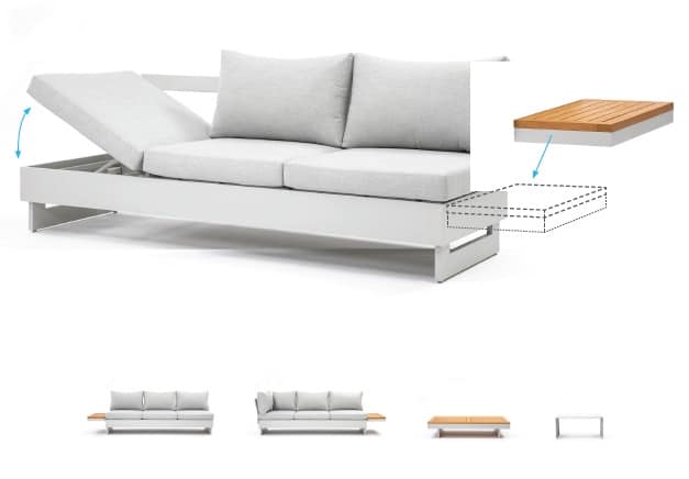 | Multifunctioneel | Verplaatsbare rugleuningen en houten plateaus volledig rondom de bank, 2x in hoogte verstelbare zitting, Diverse bankopstellingen mogelijk. |