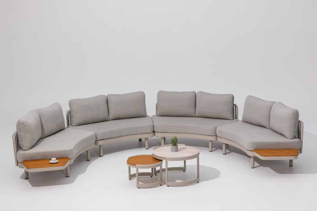Omdat de drie bankjes volledig identiek zijn, kun je diverse opstellingen maken. Creëer een klassieke U-vorm voor gezellige gesprekken, een halve rondzit bij het zwembad of een speelse S-vorm voor een uniek effect. Wil je de loungeset rondzit uitbreiden? De 2-zits bankjes Nanda zijn optioneel extra bij te bestellen zonder het houten tafeltje. Het sterke aluminium frame is gemaakt om het hele jaar buiten te blijven staan. Elk zitkussen heeft een royale dikte van 15cm met waterafstotende Olefin bekleding. De tafelbladen van sintered stone zijn extreem duurzaam en bestand tegen krassen en hitte.