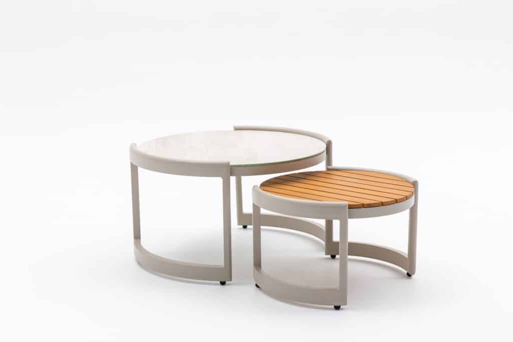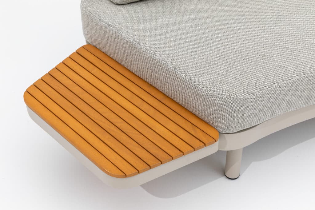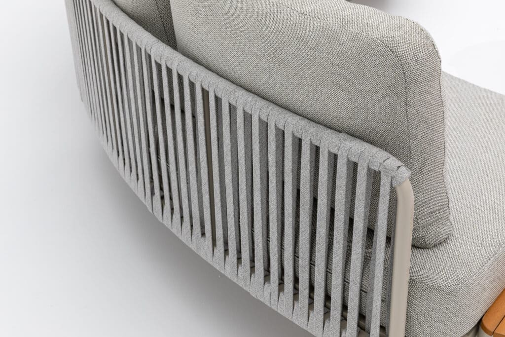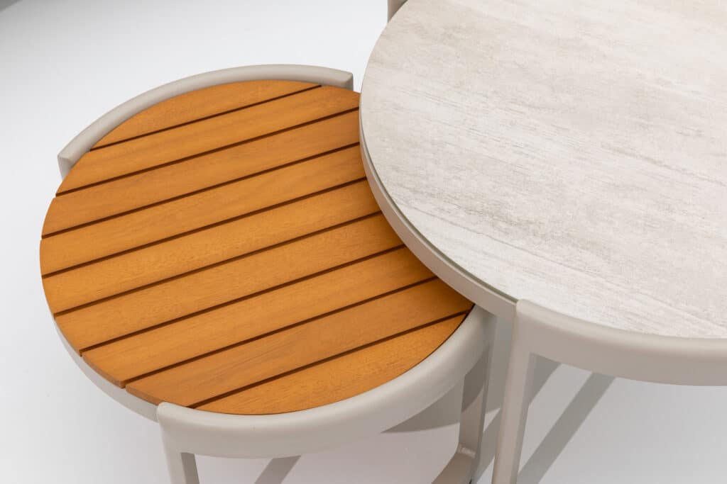 Gepoedercoat aluminium, FSC Acacia hout, Sintered stone, Rope