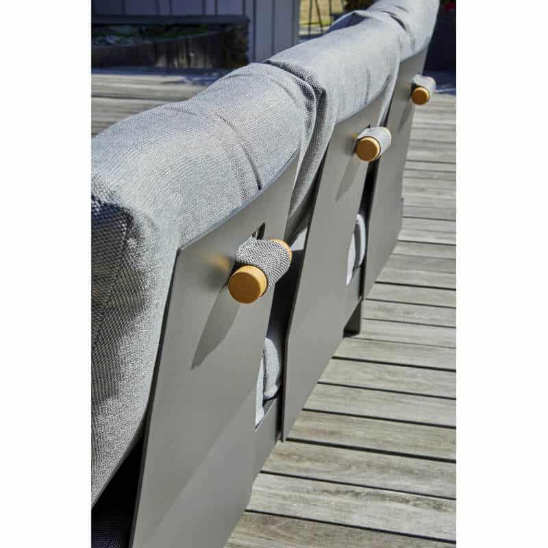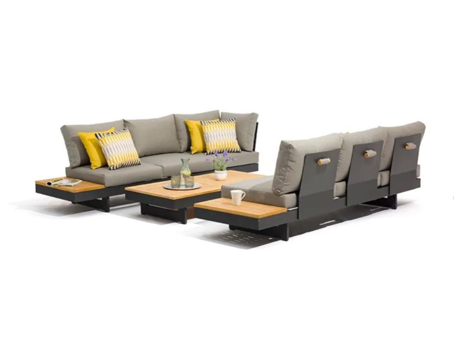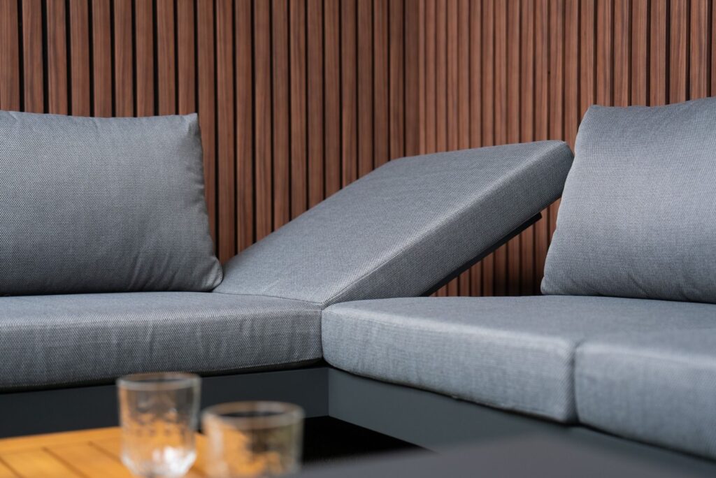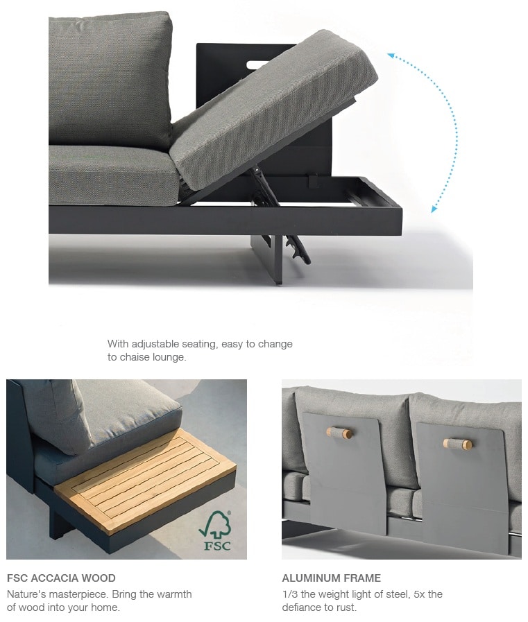 Deze loungeset is echt multifunctioneel en past zich volledig aan jouw manier van ontspannen aan. In een handomdraai creëer je twee losse banken, een ruime hoekbank of comfortabele bedden om heerlijk op te relaxen. De rugleuningen zijn volledig rondom de banken te plaatsen en de houten plateaus zijn verplaatsbaar. Beide banken hebben een in hoogte verstelbare zitting. Zo pas je de set gemakkelijk aan naar elke situatie van de dag. De dikke zitkussens van 12cm zijn gemaakt van waterafstotende Olefin stof. Het gepoedercoat aluminium frame in antraciet is roestvrij en onderhoudsarm. De FSC Acacia hardhouten accenten zorgen voor een warme uitstraling.
