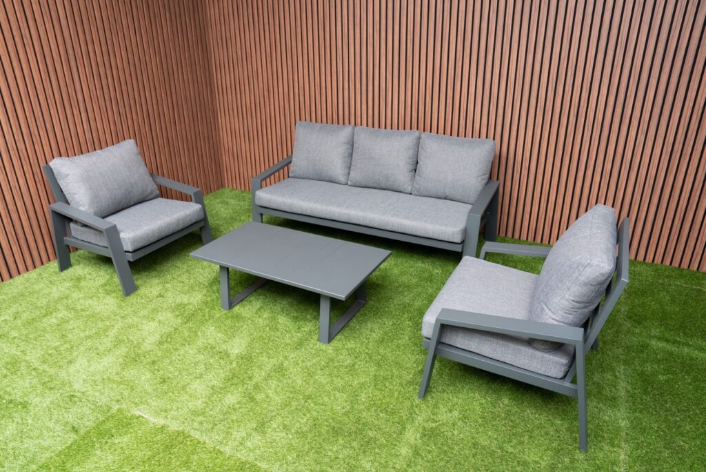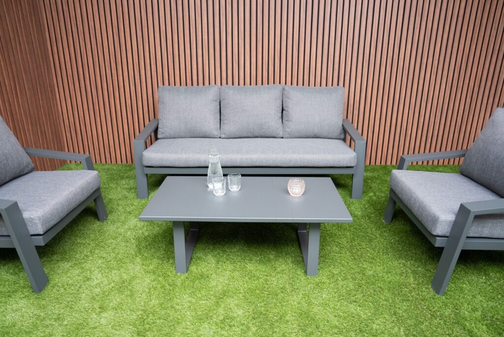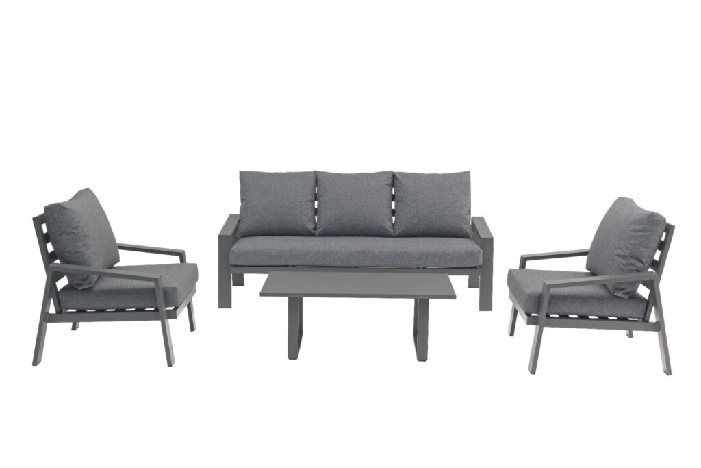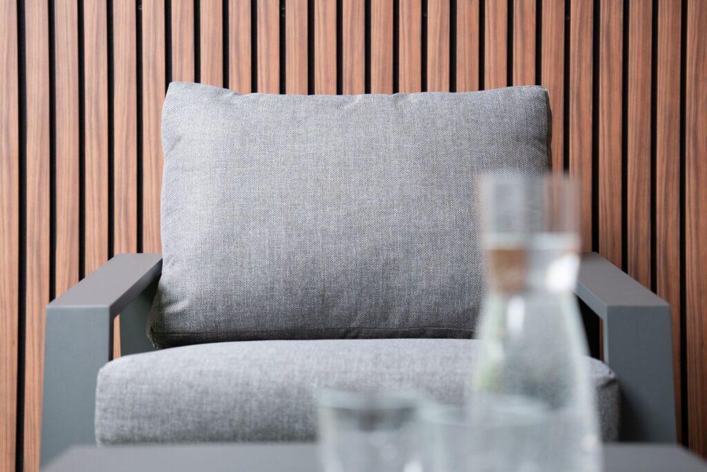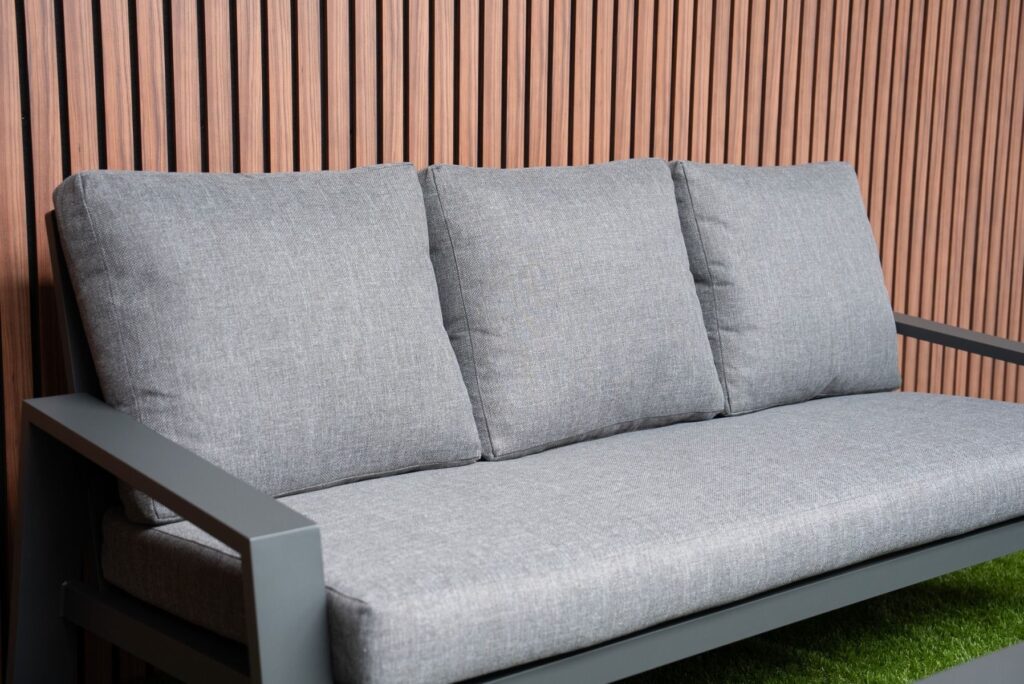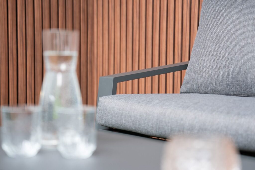 Dit is een hele ruime set met extra brede zittingen waar je heerlijk in wegzakt. De zitting loopt licht schuin af waardoor je automatisch in een ontspannen houding zit. De dikke zit- en rugkussens van 12cm zijn extra goed gevuld en gemaakt van waterafstotende Olefin stof. Dit zorgt voor een ongeëvenaard zitcomfort. Met een zithoogte van 42cm en een diepe zitting van 50cm zit je perfect om te relaxen. Het gepoedercoat aluminium frame in elegant antraciet is lichtgewicht, stevig en vraagt nauwelijks onderhoud. Hierdoor plaats je de set flexibel in de tuin of op het terras.