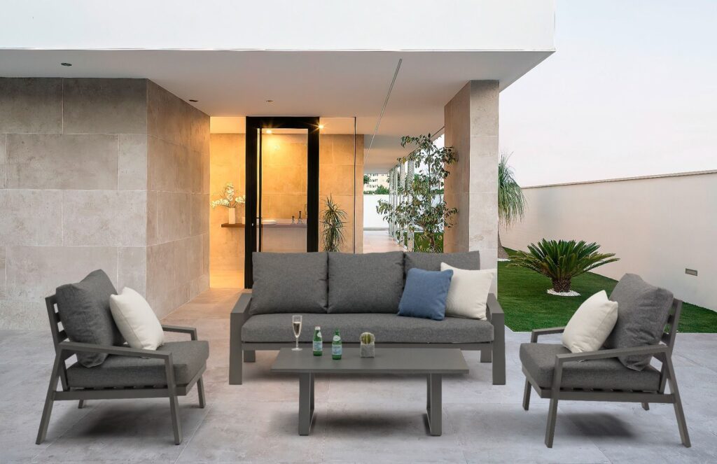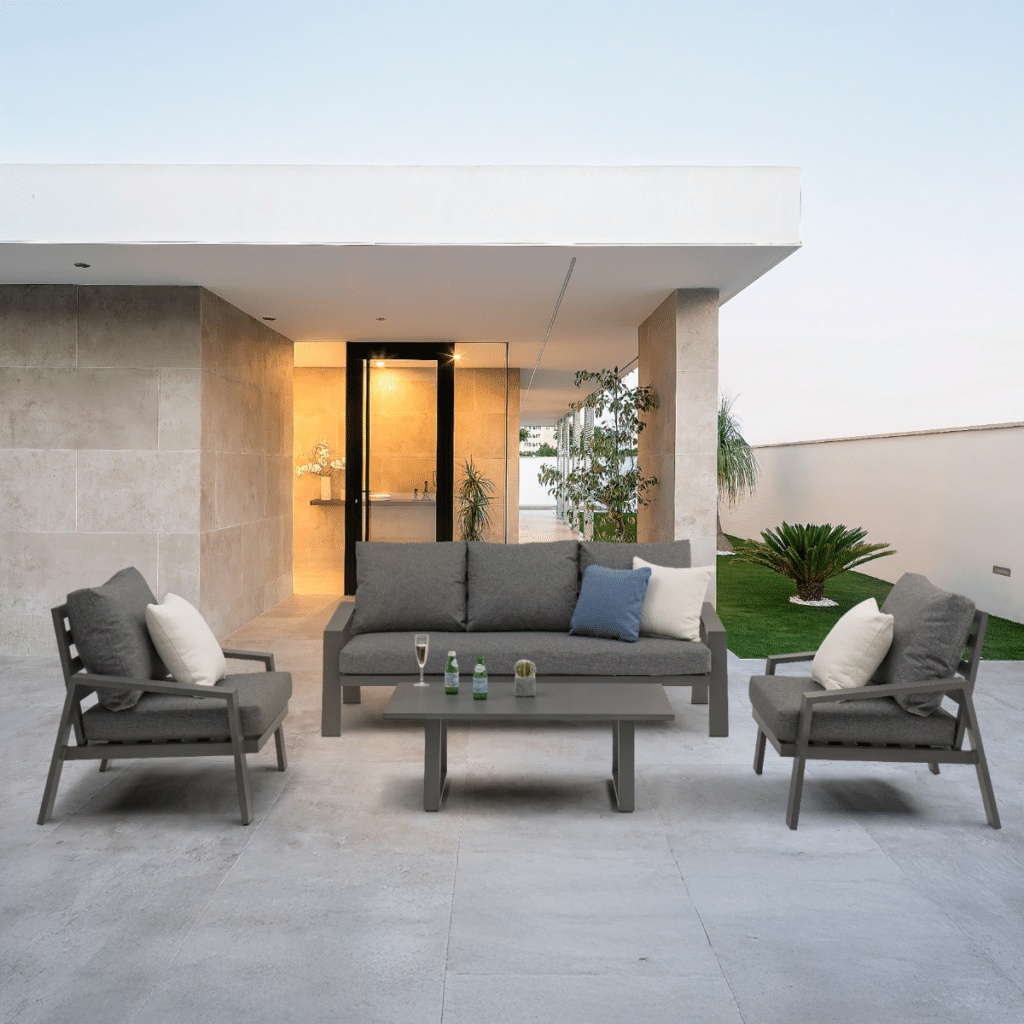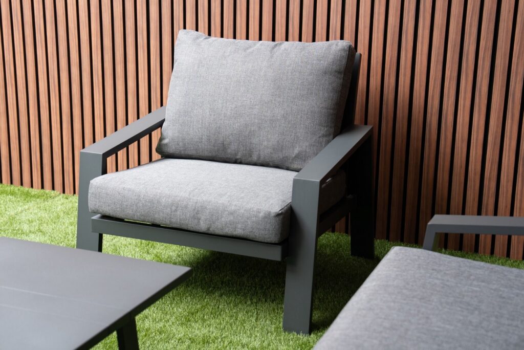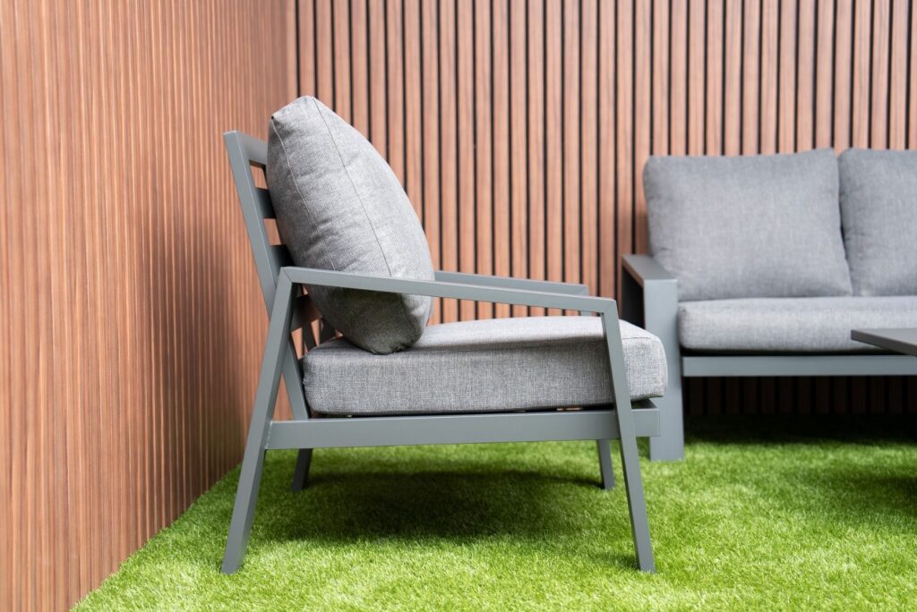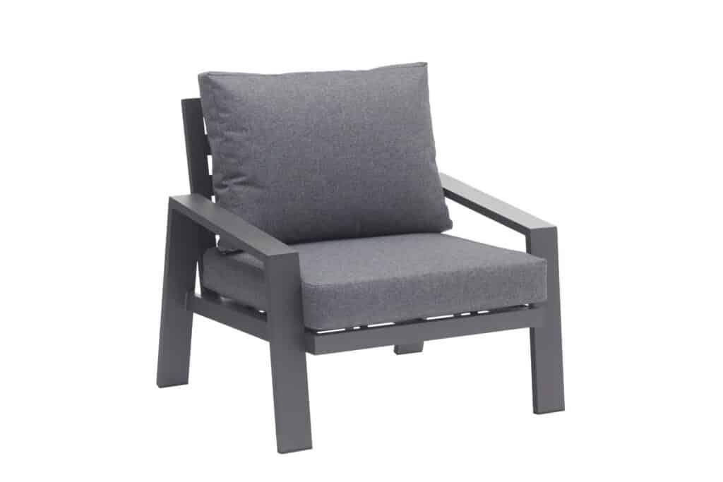 Dit is een hele ruime set met extra brede zittingen waar je heerlijk in wegzakt. De zitting loopt licht schuin af waardoor je automatisch in een ontspannen houding zit. De dikke zit- en rugkussens van 12cm zijn extra goed gevuld en gemaakt van waterafstotende Olefin stof. Dit zorgt voor een ongeëvenaard zitcomfort. Met een zithoogte van 42cm en een diepe zitting van 50cm zit je perfect om te relaxen. Het gepoedercoat aluminium frame in elegant antraciet is lichtgewicht, stevig en vraagt nauwelijks onderhoud. Hierdoor plaats je de set flexibel in de tuin of op het terras.