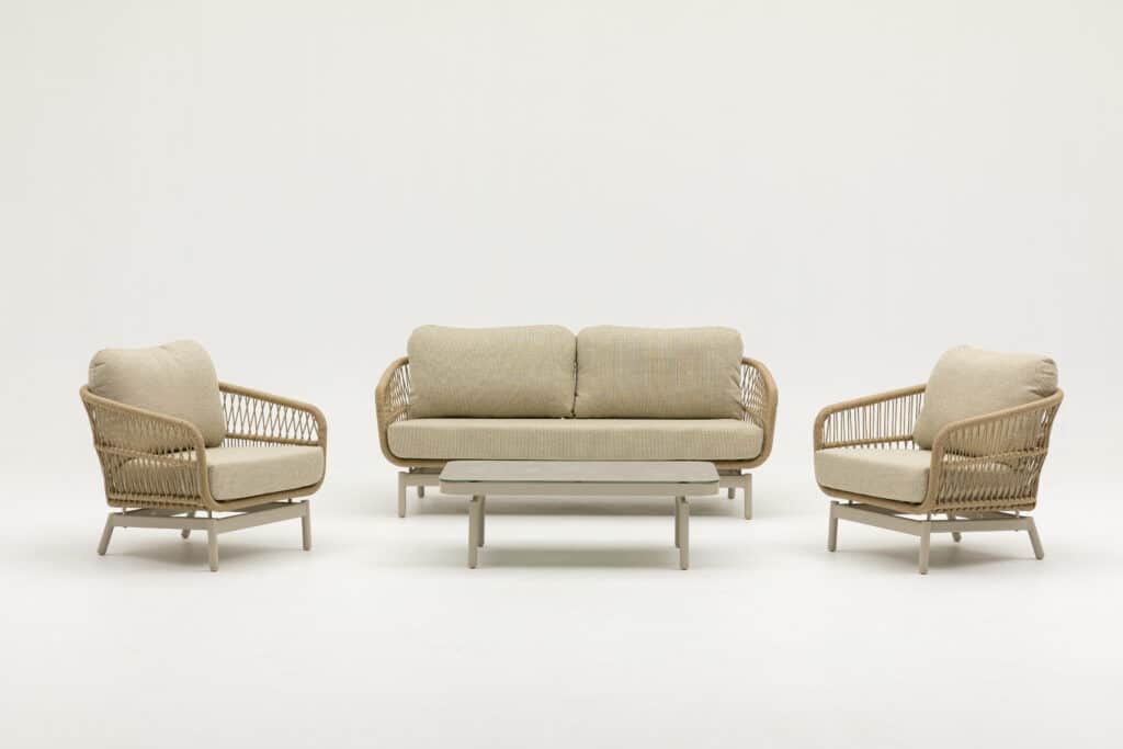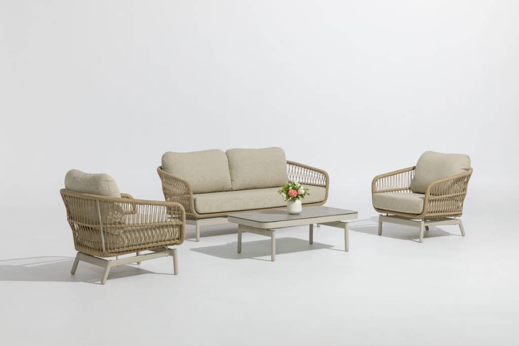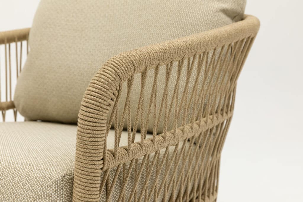De Carlijn is ontworpen met oog voor detail en kwaliteit. Het stevige aluminium frame in warm wit creme biedt stabiliteit en is tevens licht van gewicht. Hierdoor verplaats je de set eenvoudig. De naturel bruine touwdetails in V-patroon geven de set een unieke en elegante look. De royale kussens van maar liefst 15cm dik zijn bekleed met waterafstotende Olefin stof in warm wit. Met een zithoogte van 42cm geniet je van optimaal perfect zitcomfort. De tafel is voorzien van een 5mm keramisch glazen blad voor een luxe en onderhoudsvriendelijke afwerking.