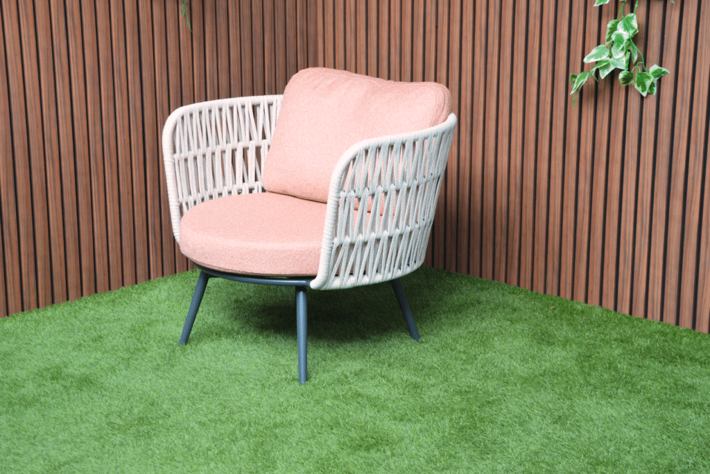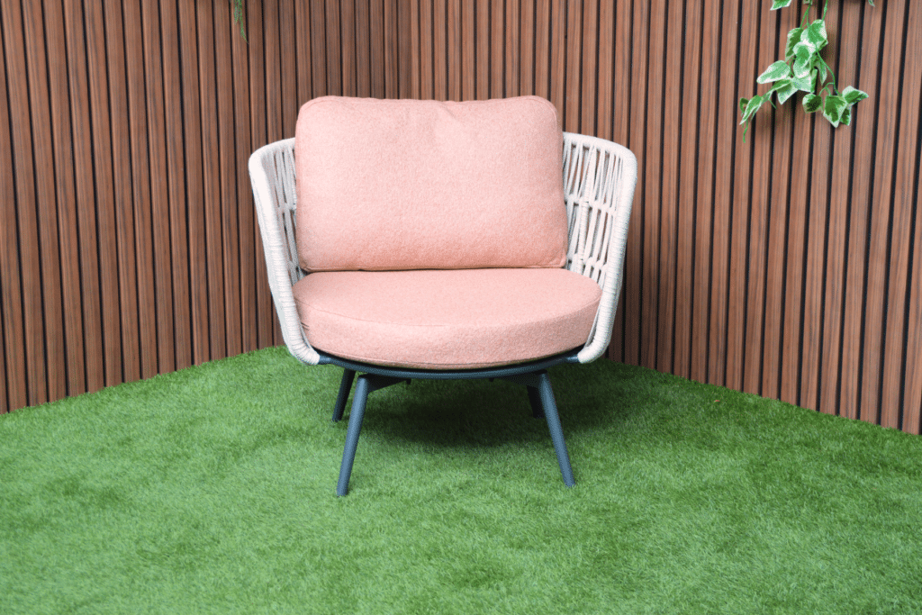 De ruime rond gevormde stoelen met een zithoogte van 40cm nodigen uit om lekker te gaan zitten en te relaxen. De dikke comfortabele zitkussens van 10cm zijn gemaakt van waterafstotende Olefin stof, ideaal voor buiten. De goed opgevulde rugkussens bieden perfecte ondersteuning. De armleuningen op 76cm hoogte zorgen voor extra gemak waar je heerlijk tegen aan kunt liggen. Het handige bijzettafeltje (53x49x51cm) is perfect voor een kopje koffie of een goed boek. Het gepoedercoate aluminium frame is licht, roestvrij en kan het hele jaar buiten blijven staan.