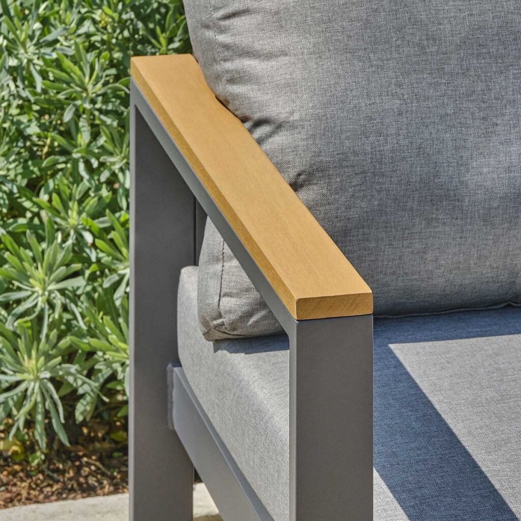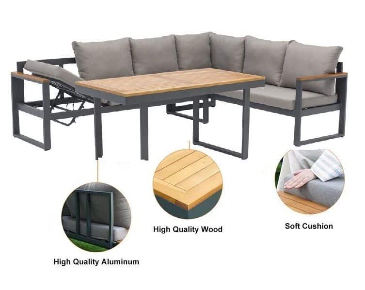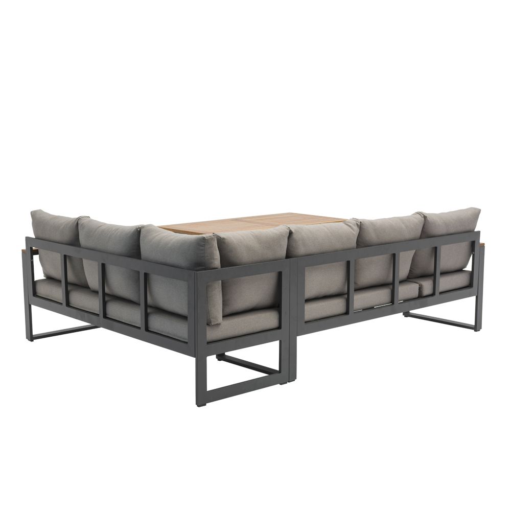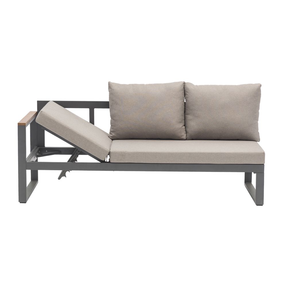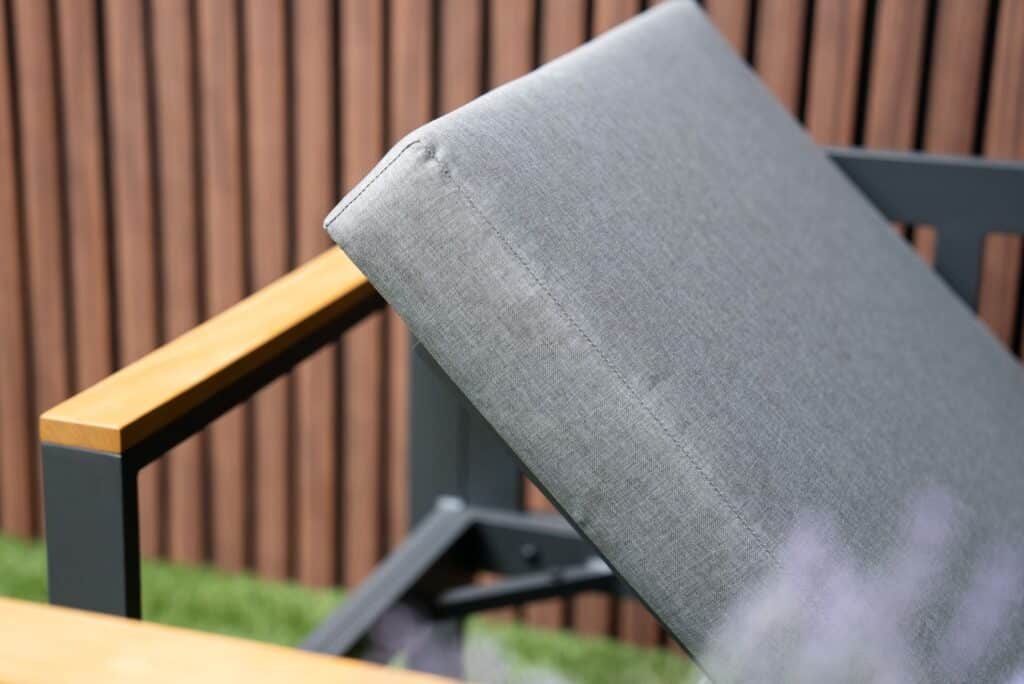De linkerbank heeft een in hoogte verstelbare zitting, zodat je eenvoudig kunt wisselen tussen zitten en languit liggen. De dikke zitkussens van 10cm zijn gemaakt van waterafstotend polyester en bieden direct heerlijk comfort. Met een zithoogte van 45cm en een zitdiepte van 65cm zit je perfect ontspannen. Het gepoedercoat aluminium frame in antraciet is lichtgewicht, roestvrij en onderhoudsarm. De warme FSC Acacia hardhouten armleuningen zorgen voor een mooie balans tussen modern en natuurlijk.