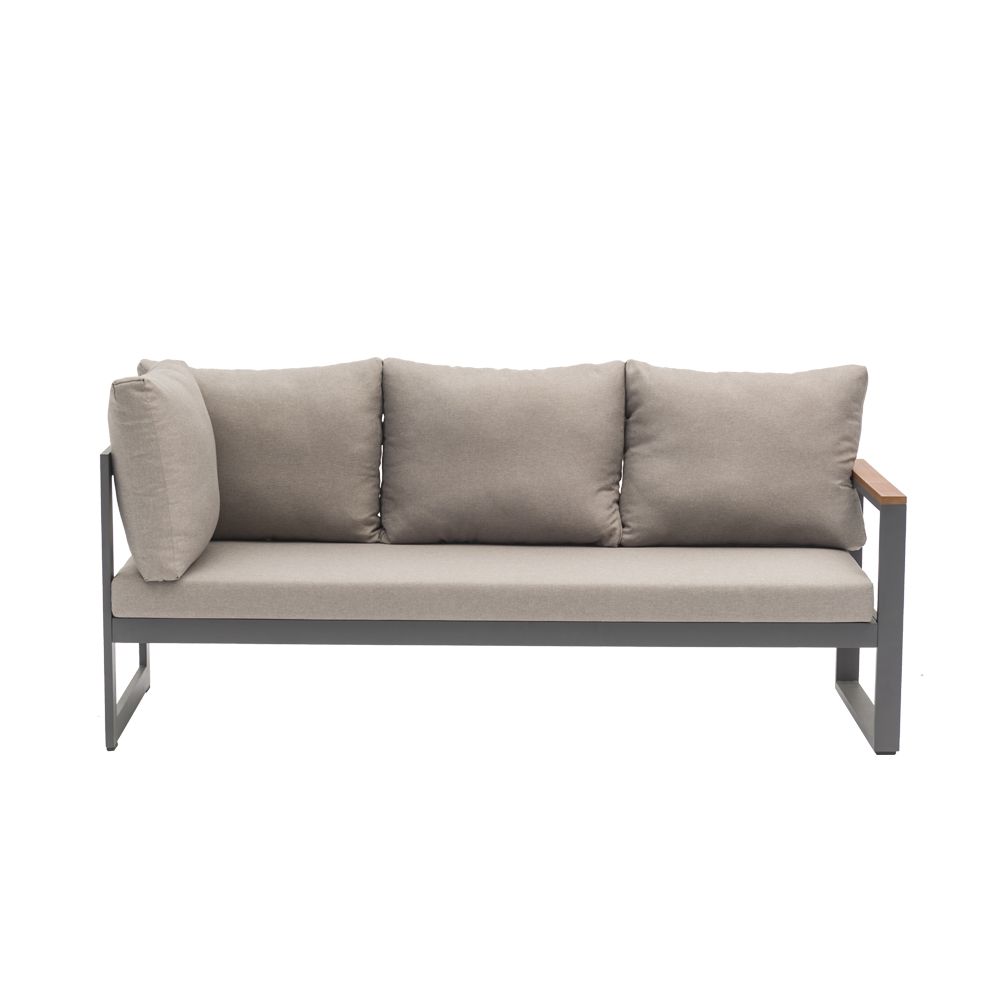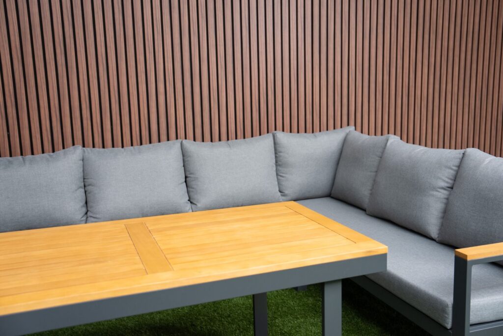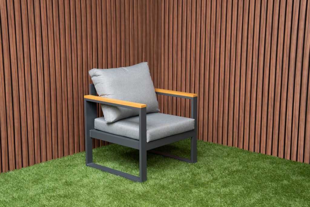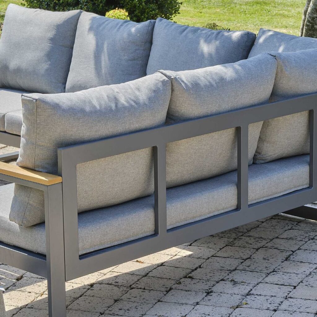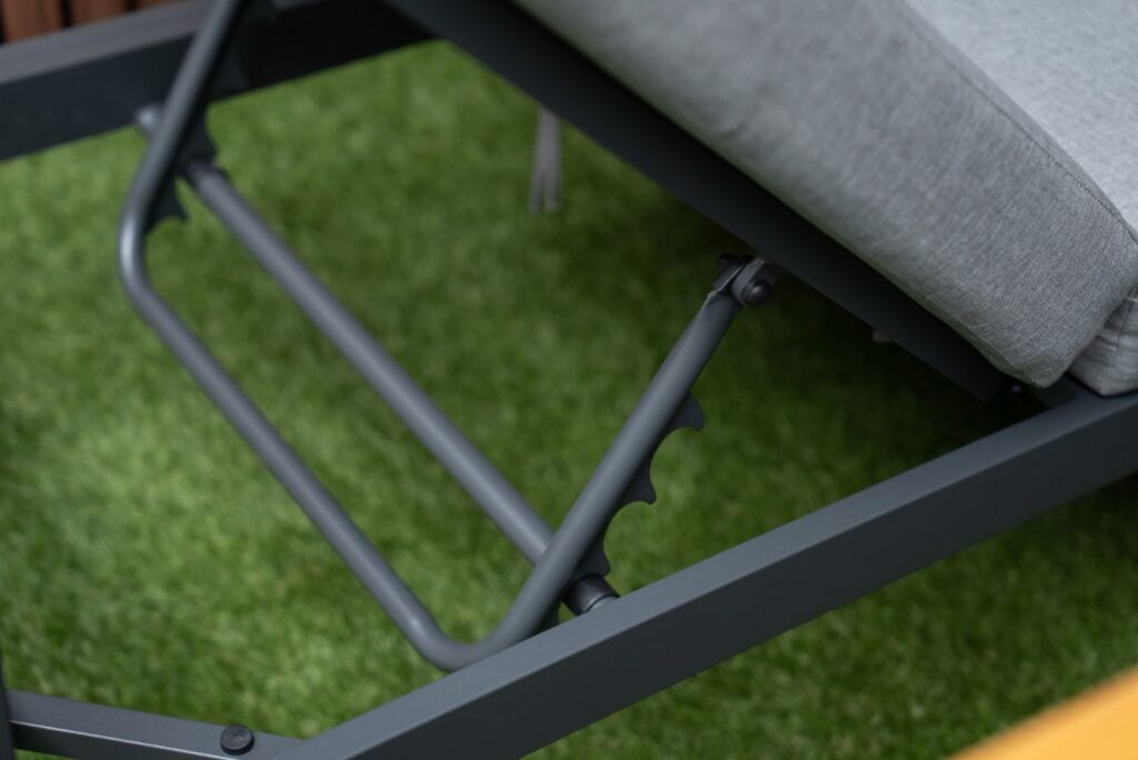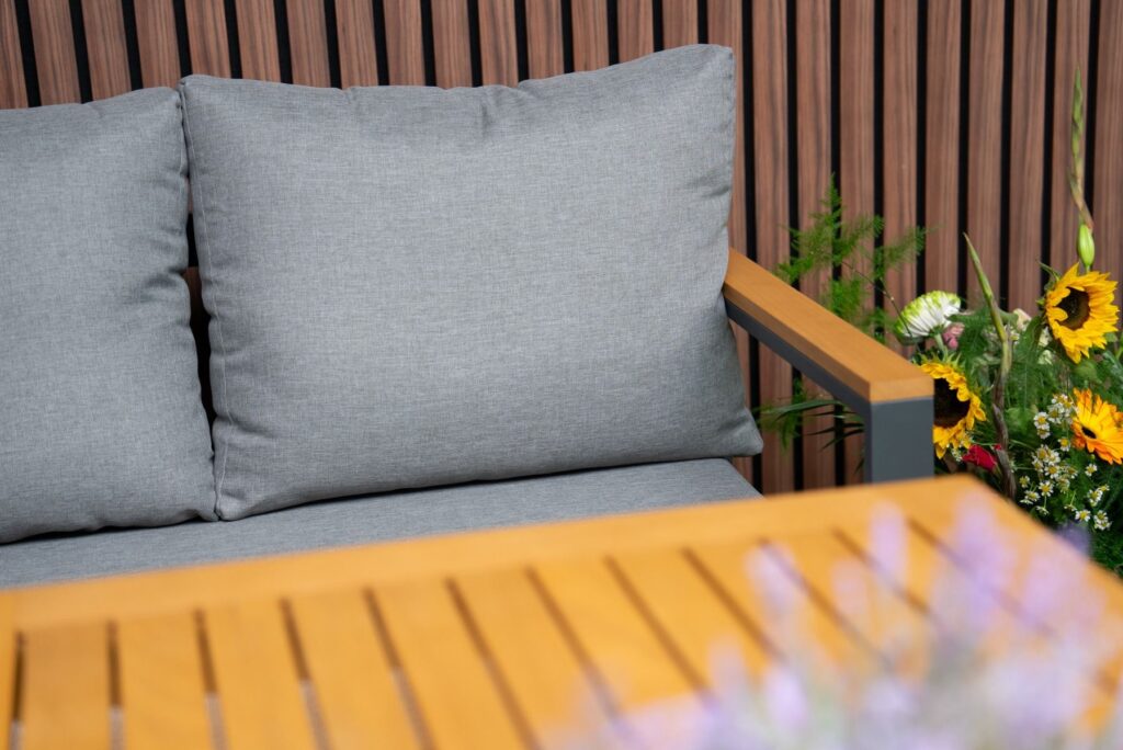 De linkerbank heeft een in hoogte verstelbare zitting, zodat je eenvoudig kunt wisselen tussen zitten en languit liggen. De dikke zitkussens van 10cm zijn gemaakt van waterafstotend polyester en bieden direct heerlijk comfort. Met een zithoogte van 45cm en een zitdiepte van 65cm zit je perfect ontspannen. Het gepoedercoat aluminium frame in antraciet is lichtgewicht, roestvrij en onderhoudsarm. De warme FSC Acacia hardhouten armleuningen zorgen voor een mooie balans tussen modern en natuurlijk.