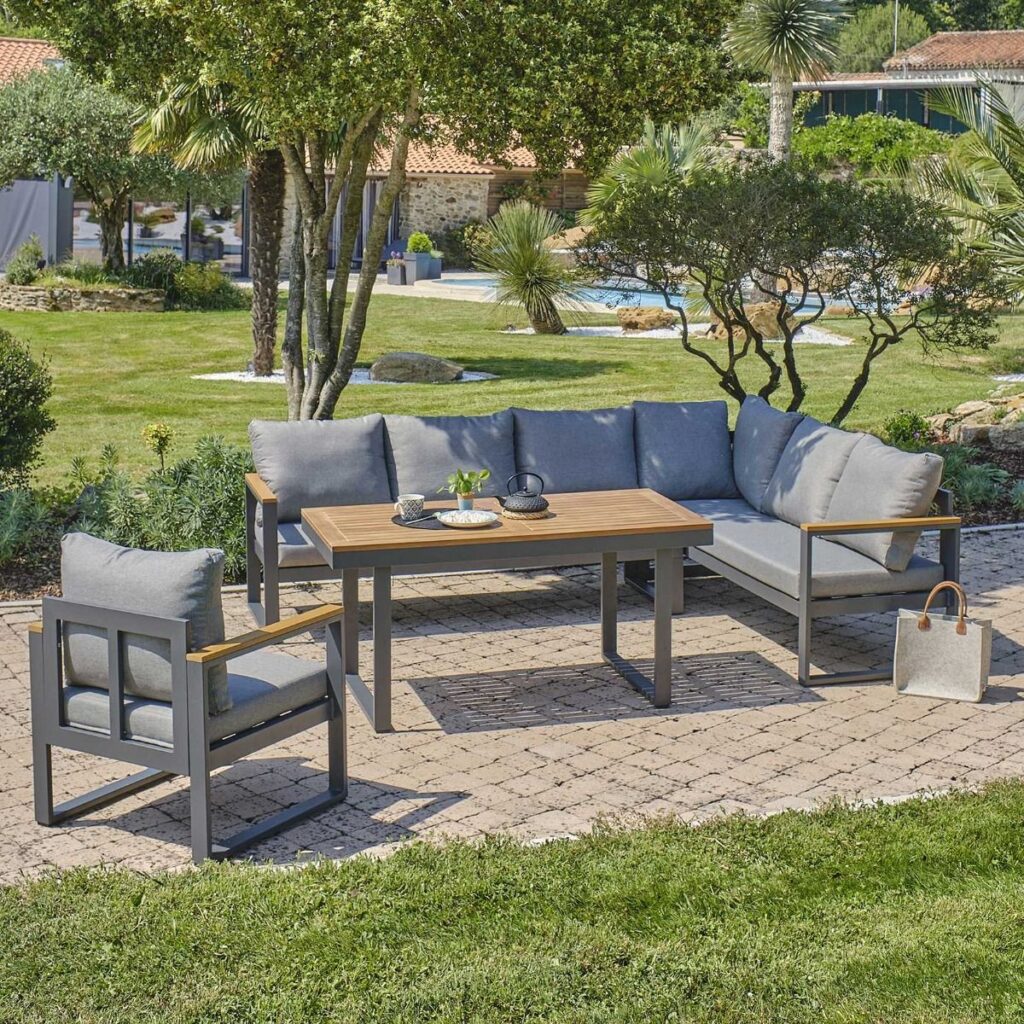 Zoek je een stijlvolle hoekbank voor zowel loungen als dineren? De Loungeset Cube Antraciet Hoekbank Diningset Aluminium/Hout 22380A is ontworpen voor iedereen die een moderne en comfortabele zithoek in de tuin wil creëren. Deze complete set bestaat uit een linkerbank van 185x65x71cm met in hoogte verstelbare zitting, een rechterbank van 187x65x71cm en een ruime eettafel van 140x70x68cm. De luxe uitstraling en het doordachte zitcomfort maken deze set perfect voor relaxte zomermomenten met familie en vrienden.