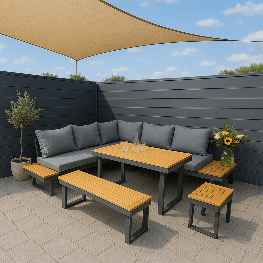 Het gepoedercoat aluminium frame in antraciet is lichtgewicht en roestvrij. De FSC Acacia hardhouten accenten geven een warme en natuurlijke uitstraling. De kleur van het frame is 100% gelijk aan alle andere tuinmeubelen op onze website in antraciet. Hierdoor combineer je deze diningset moeiteloos met stoelen, loungesets en fauteuils. Klaar om jouw buitenruimte te transformeren? Bestel de Loungeset SenS-Line Olympia Diningset Family Hoekbank nu en geniet van maximale veelzijdigheid.