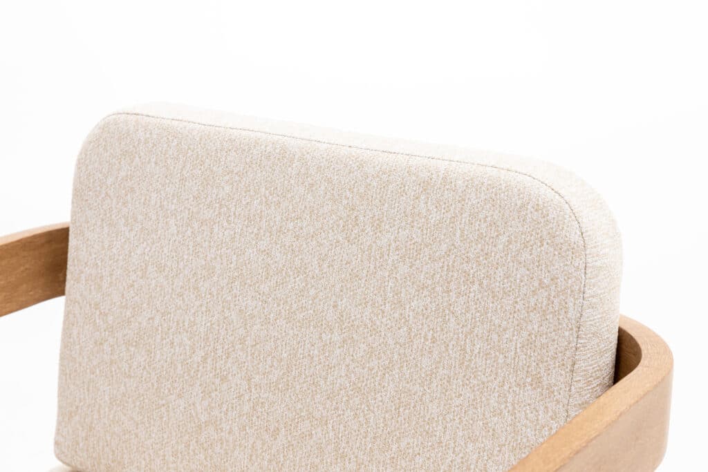 Het frame is gemaakt van gepoedercoat aluminium in een warme natuurlijke houtlook. Dit materiaal is licht, roestvrij en bestand tegen alle weersomstandigheden. Het zitkussen van 5cm dik is uitgevoerd in warm witte stof van all weather polyester. Regen of felle zon? Geen probleem. Zo geniet je zorgeloos van relaxte momenten buiten zonder veel onderhoud.