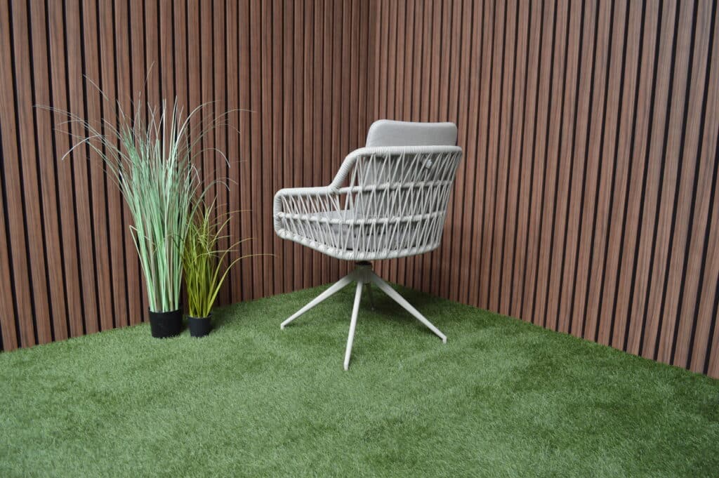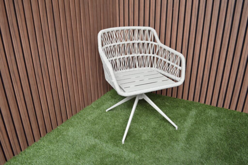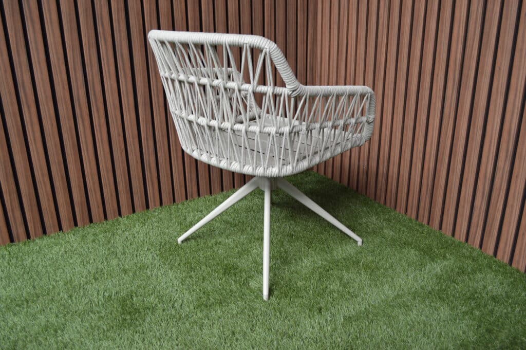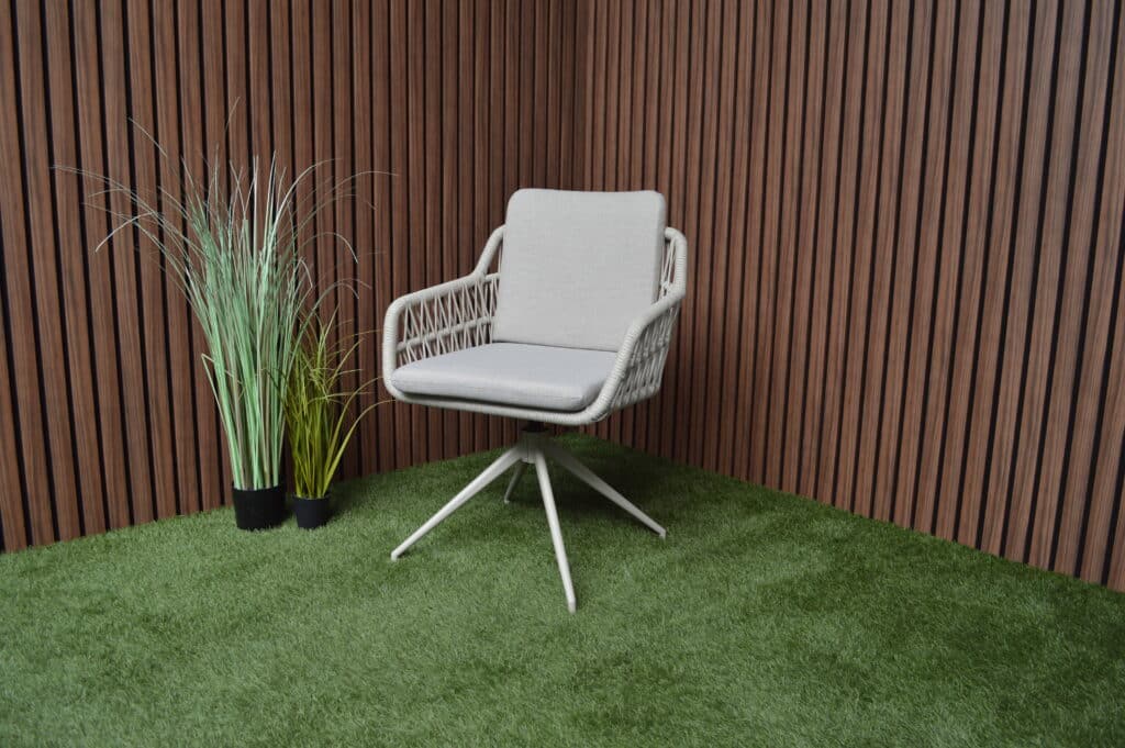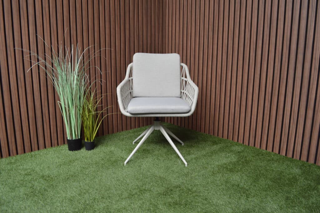 Op zoek naar een comfortabele tuinstoel met dat beetje extra? De Sevilla Warm Wit is de perfecte keuze voor wie luxe en gemak combineert. Deze draaibare tuinstoel draait 360 graden, zodat je makkelijk met vrienden kunt praten zonder het onderstel te verplaatsen. Wanneer je opstaat, draait de stoel automatisch terug naar de originele stand. Zo staan je stoelen altijd netjes aan tafel. Het gevlochten touw in de rugleuning zorgt voor een prachtige moderne en luxe uitstraling.