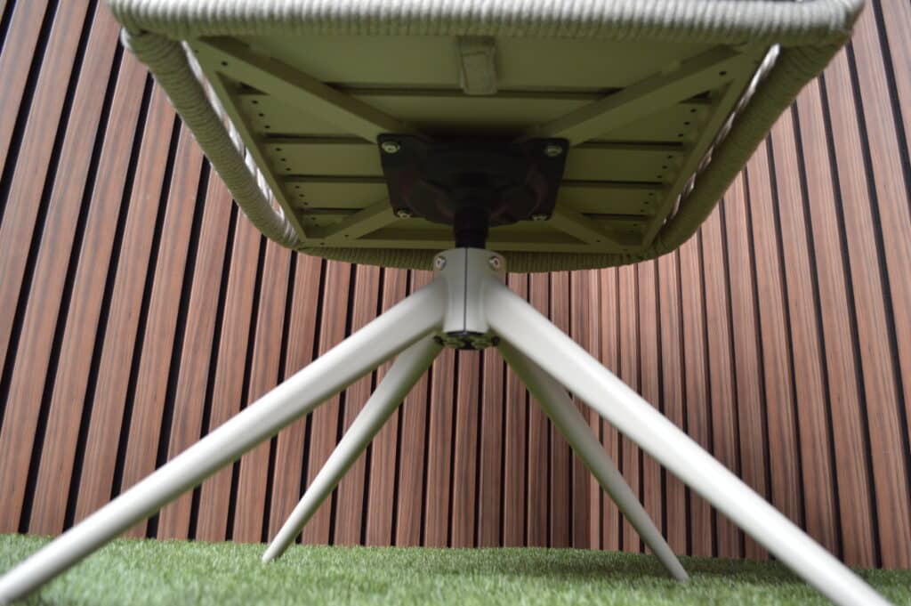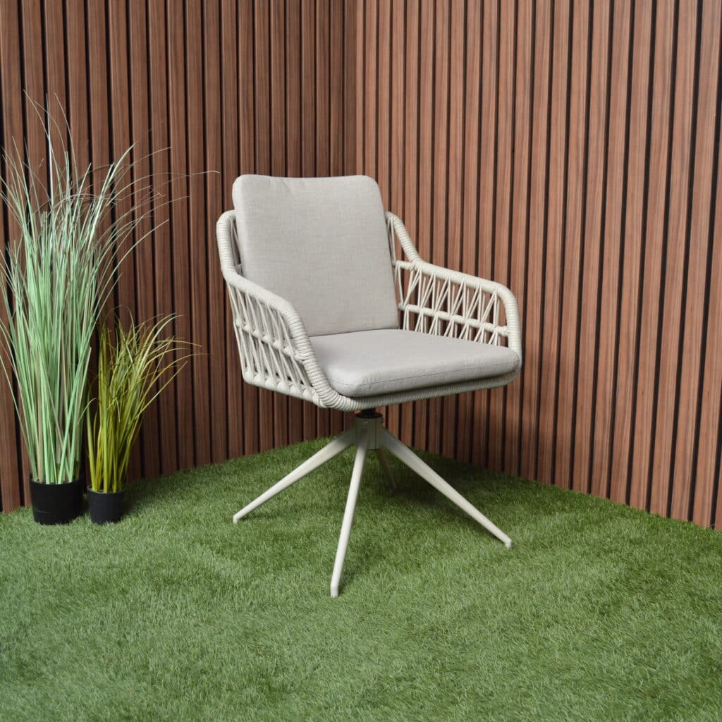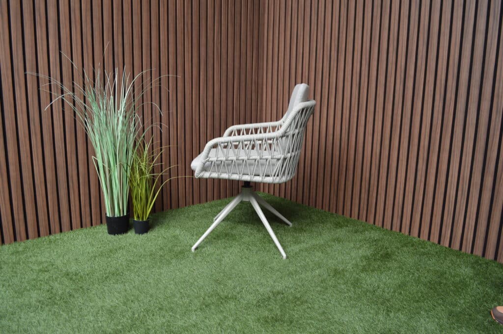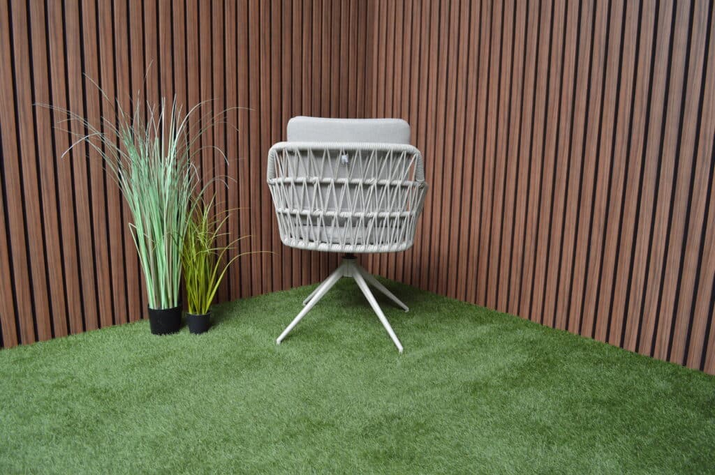 Op zoek naar een comfortabele tuinstoel met dat beetje extra? De Sevilla Warm Wit is de perfecte keuze voor wie luxe en gemak combineert. Deze draaibare tuinstoel draait 360 graden, zodat je makkelijk met vrienden kunt praten zonder het onderstel te verplaatsen. Wanneer je opstaat, draait de stoel automatisch terug naar de originele stand. Zo staan je stoelen altijd netjes aan tafel. Het gevlochten touw in de rugleuning zorgt voor een prachtige moderne en luxe uitstraling.