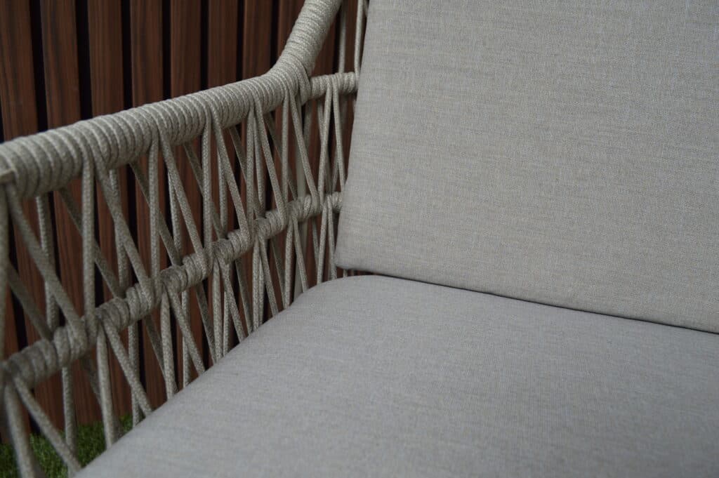 Met een ruime afmeting van 63x61x81cm en een zithoogte van 48cm zit je heerlijk aan elke tuintafel. Het 5cm dikke polyester zitkussen en het comfortabele rugkussen in warm taupe bieden optimale ondersteuning. De armleuningen op 63cm hoogte maken opstaan en gaan zitten makkelijk. Het gepoedercoate aluminium frame in warm wit is licht, roestvrij en kan het hele jaar buiten blijven staan. Het rope vlechtwerk is weerbestendig en verkleurt niet snel.