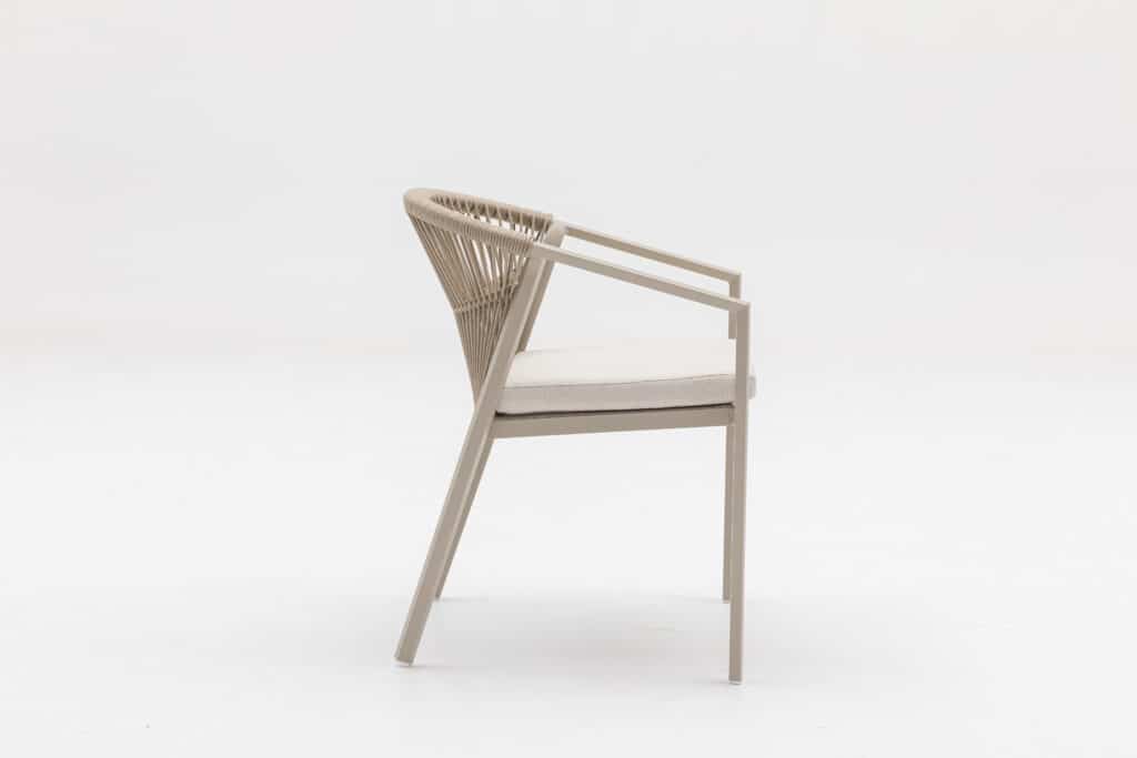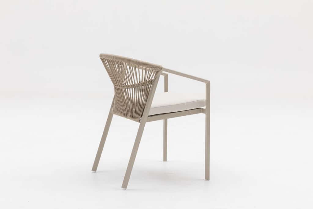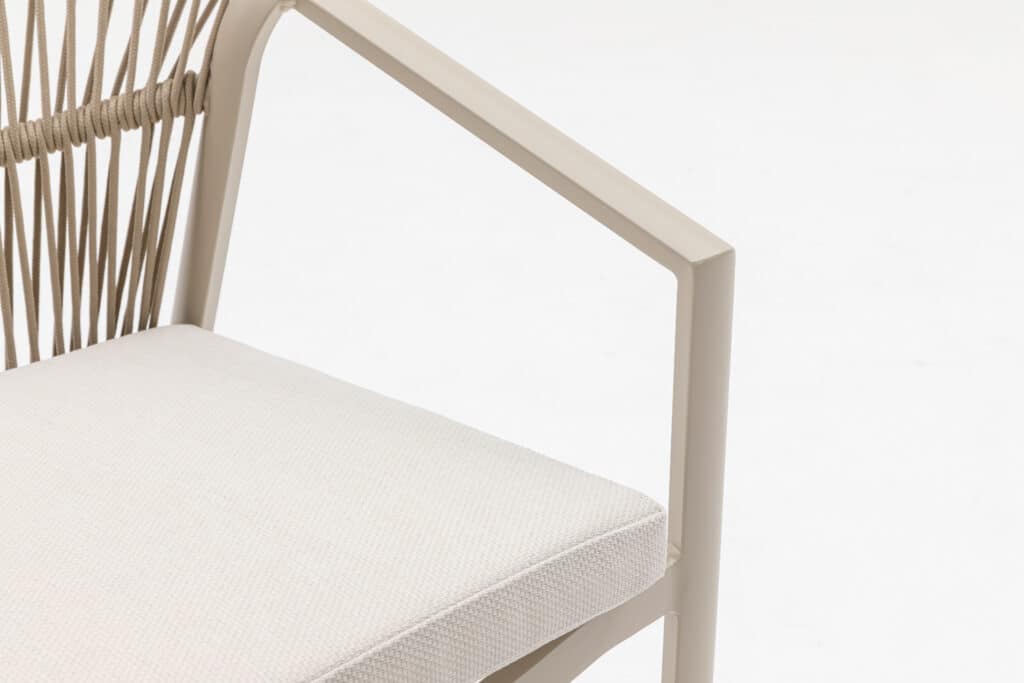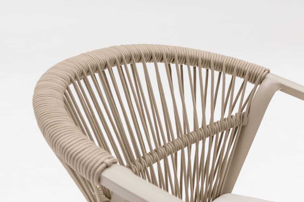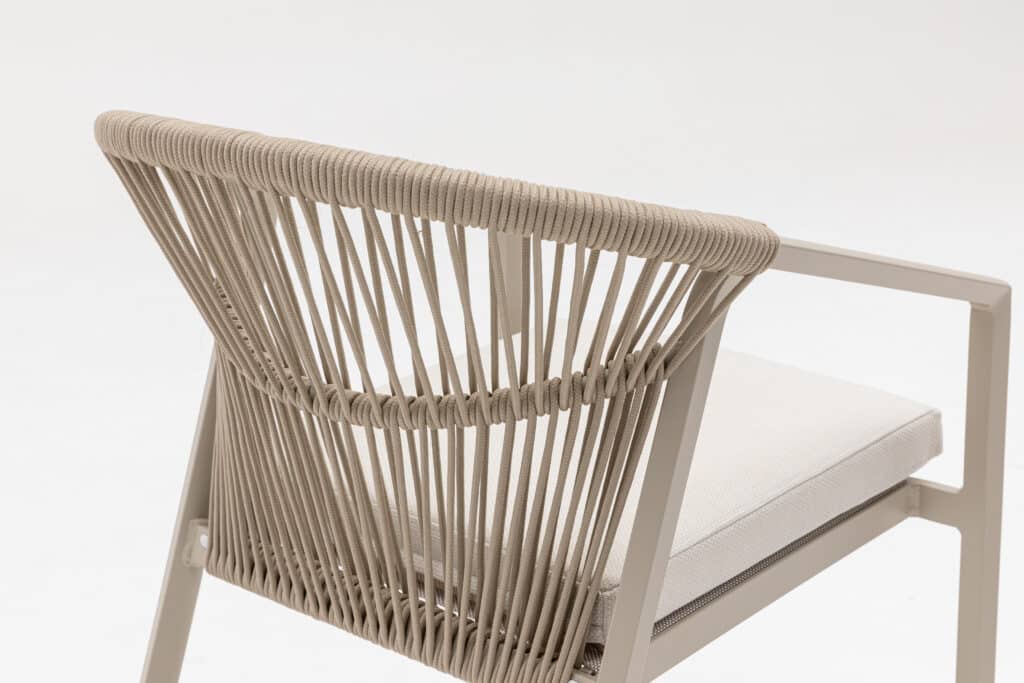Met een zithoogte van 48cm zit je heerlijk aan tafel. Het 5cm dikke polyester zitkussen zorgt voor langdurig comfort tijdens etentjes of relaxte momenten buiten. Het touw in de rugleuning biedt goede ondersteuning en een luxe uitstraling. De moderne armleuningen op 63cm hoogte maken opstaan makkelijk. Met een afmeting van 56x59x79cm heb je voldoende zitruimte zonder dat de stoel te veel plaats inneemt.