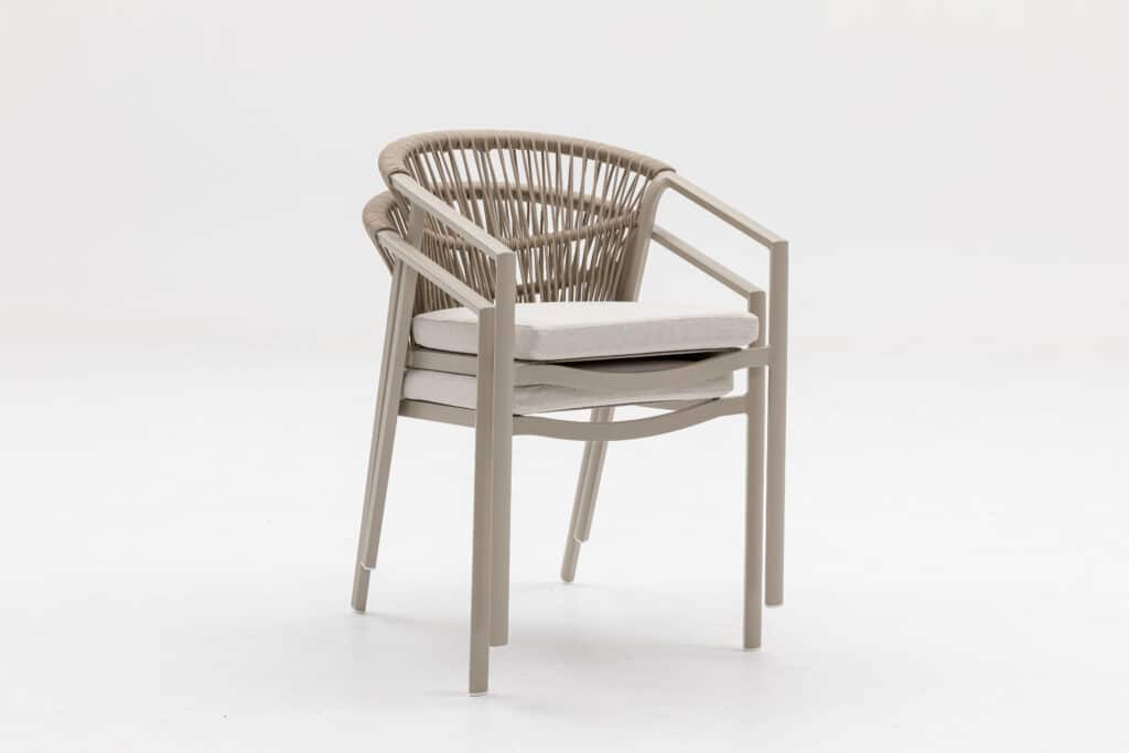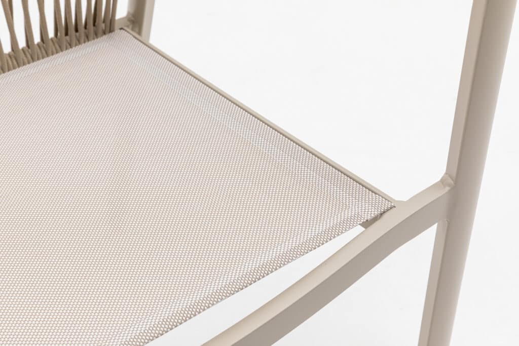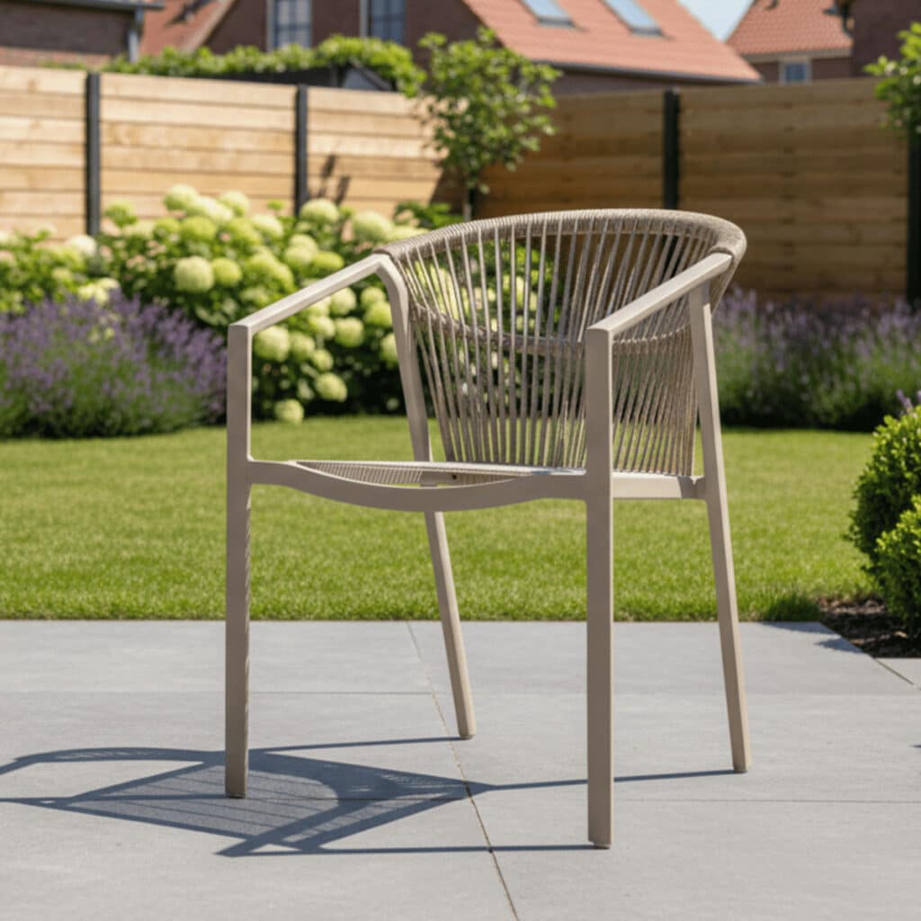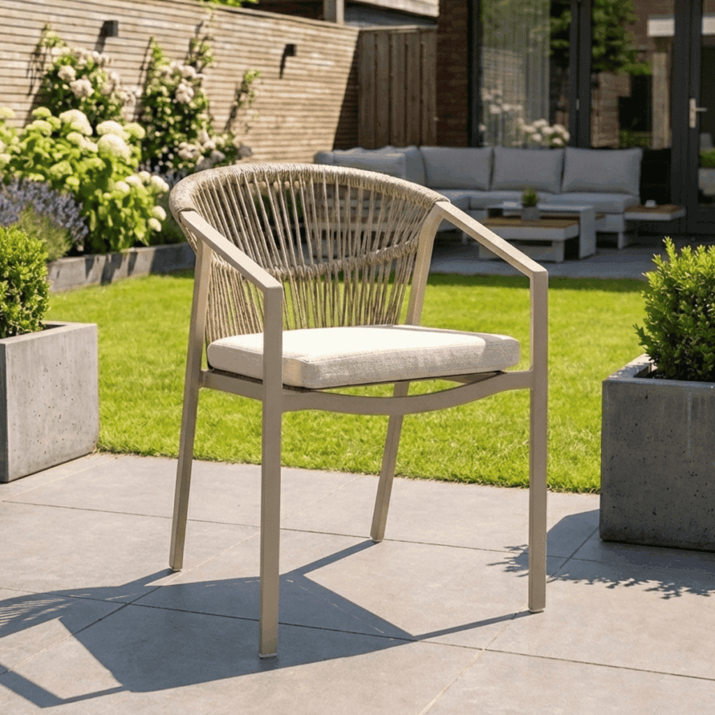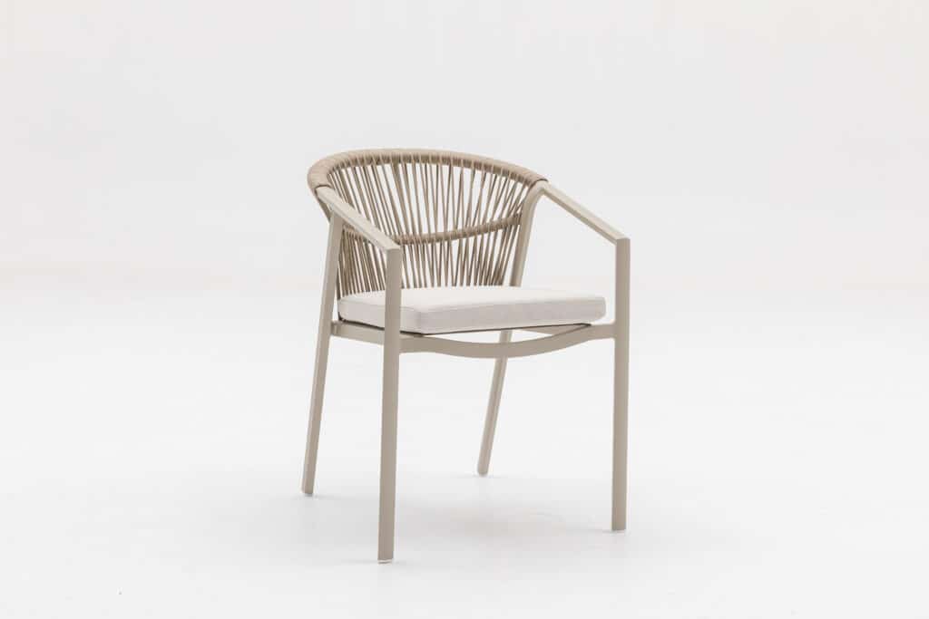 Met een zithoogte van 48cm zit je heerlijk aan tafel. Het 5cm dikke polyester zitkussen zorgt voor langdurig comfort tijdens etentjes of relaxte momenten buiten. Het touw in de rugleuning biedt goede ondersteuning en een luxe uitstraling. De moderne armleuningen op 63cm hoogte maken opstaan makkelijk. Met een afmeting van 56x59x79cm heb je voldoende zitruimte zonder dat de stoel te veel plaats inneemt.