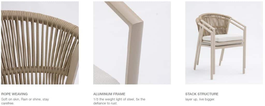Het aluminium frame is licht, roestvrij en onderhoudsarm. De tuinstoel blijft jarenlang mooi, ook na regen en zon. Het rope vlechtwerk is weerbestendig en verkleurt niet snel. Een groot voordeel: de stoelen zijn stapelbaar, waardoor je makkelijk ruimte bespaart. De warm witte kleur is 100% gelijk aan alle andere tuinmeubelen in deze kleur op onze website. Combineer de Valencia moeiteloos met bijpassende tafels, loungesets en fauteuils.