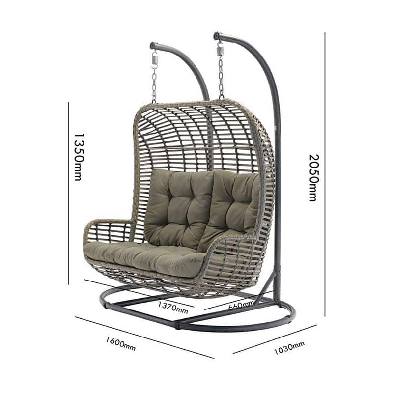 Droom je van samen relaxen in de tuin? De Luxe Hangstoel Twin Double 2-Persoons Hangei met standaard Antraciet 32320-B brengt een nieuwe dimensie van comfort naar je buitenruimte. Deze ruime hangstoel is ontworpen om samen te ontspannen en biedt echt voldoende plek voor twee personen. Met totale afmetingen van 160x103x205cm en een royaal hangei van 137x66x135cm geniet je comfortabel van heerlijke zomerdagen. De combinatie van antraciet frame, grijs wicker en taupe kussens geeft een elegante en moderne uitstraling.