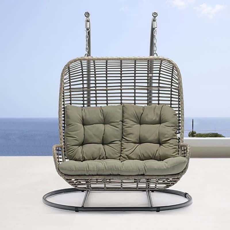 De dikke kussens van 12cm zijn gemaakt van waterafstotend polyester en voelen heerlijk zacht aan. Je zit en ligt erg comfortabel, ook wanneer je met zijn tweeën in het hangei plaatsneemt. Het frame is vervaardigd van hoogwaardig gepoedercoat staal met een maximaal draagvermogen van 225kg. Dit zorgt voor een stabiele en stevige basis. De zitmand is bekleed met weerbestendig wicker en rope, geschikt voor intensief buitengebruik. De kussens hebben uitstekende kleurvastheid en blijven lang mooi.