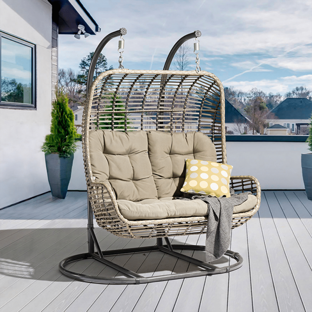 Dankzij het vrijstaande ontwerp met standaard plaats je deze hangstoel flexibel waar jij wilt. Op je terras, balkon, onder een veranda of in een gezellig hoekje van de tuin. Wil je het hangei liever elders ophangen? Dankzij de stevige ophanghaken is dit eenvoudig mogelijk aan bijvoorbeeld een stevige balk of pergola. Klaar om jouw tuin te transformeren tot een luxe relaxplek? Bestel de Luxe Hangstoel Twin Double 2-Persoons nu en geniet samen van ultieme ontspanning.