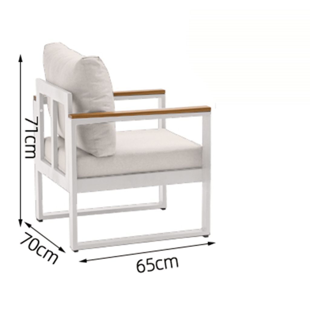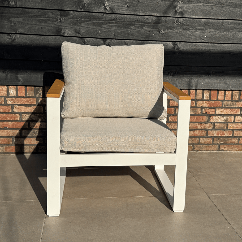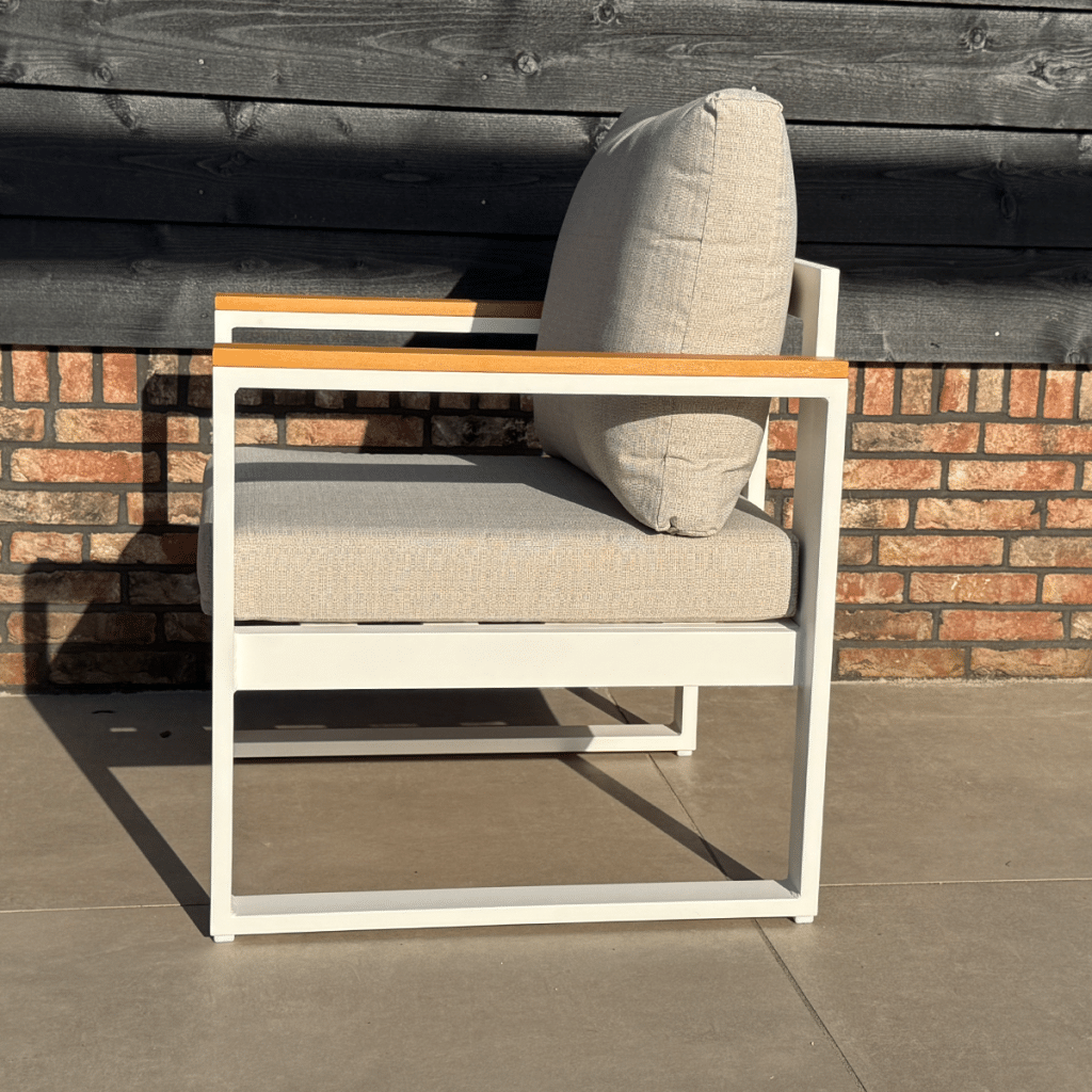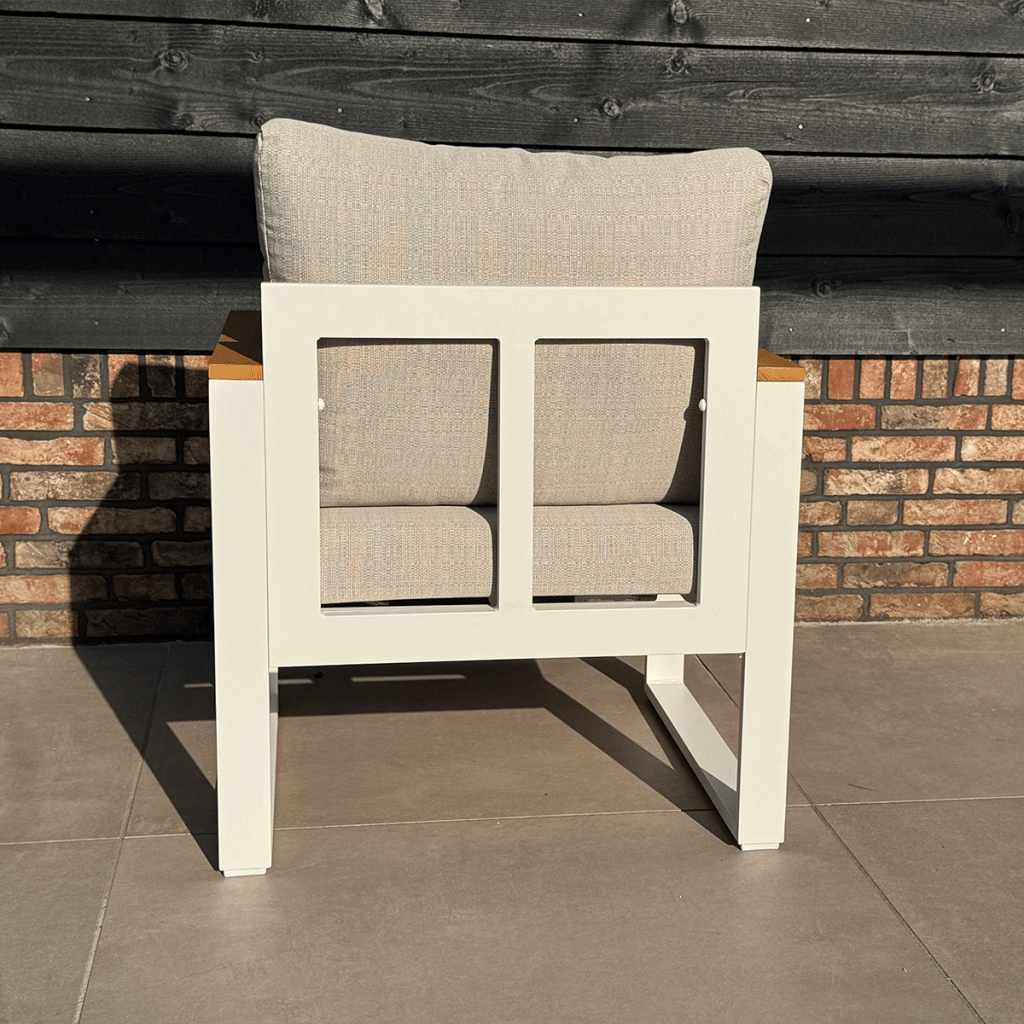 Zoek je een moderne en comfortabele tuinstoel? De Loungestoel Cube Wit Diningchair Aluminium/Hout 22381W is perfect voor luxe relaxmomenten in je tuin of op je terras. Deze ruime stoel uit de Cube collectie is 70cm breed, 65cm diep en 71cm hoog. De heerlijke dikke zit- en rugkussens van 10cm leggen je daadwerkelijk in de watten en bezorgen je een geweldig zitcomfort. De combinatie van het mat witte frame en de warme FSC Acacia houten armleuningen zorgt voor een stijlvolle en luxe uitstraling.