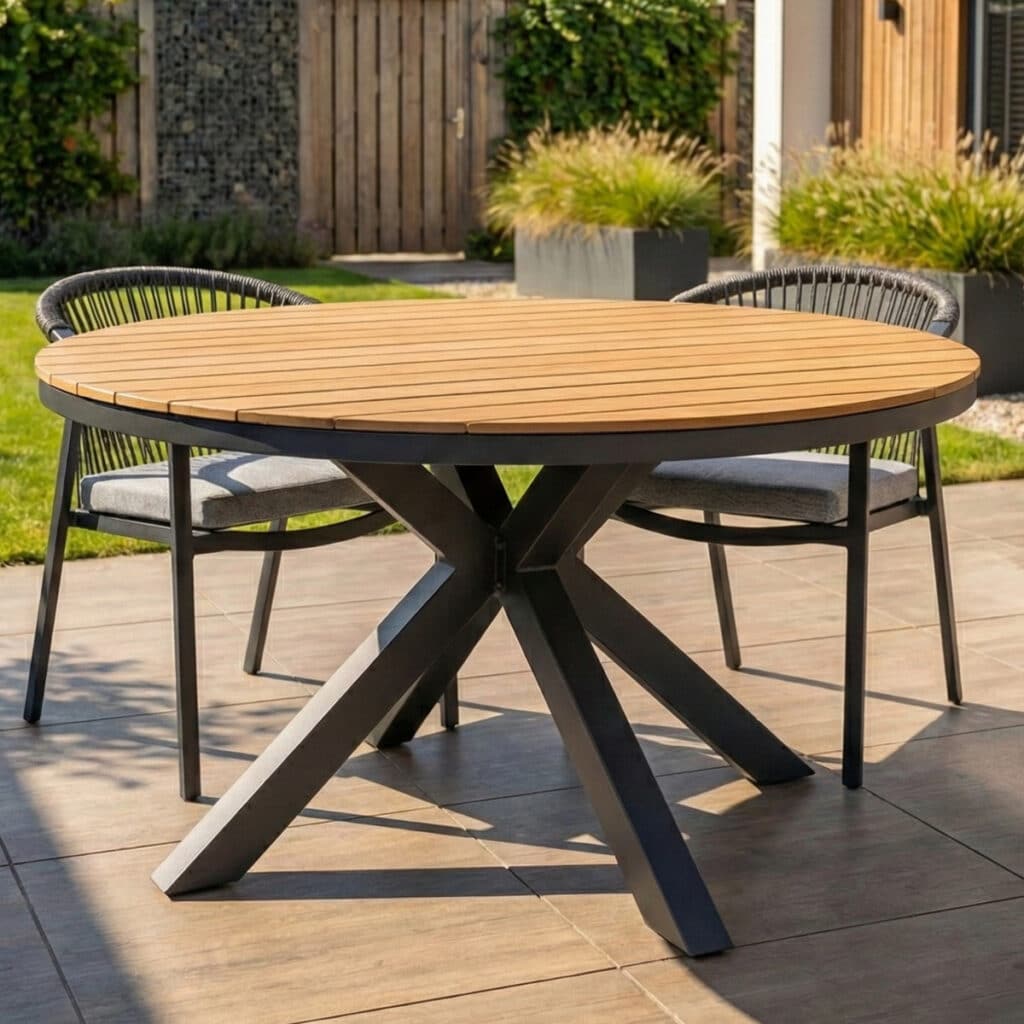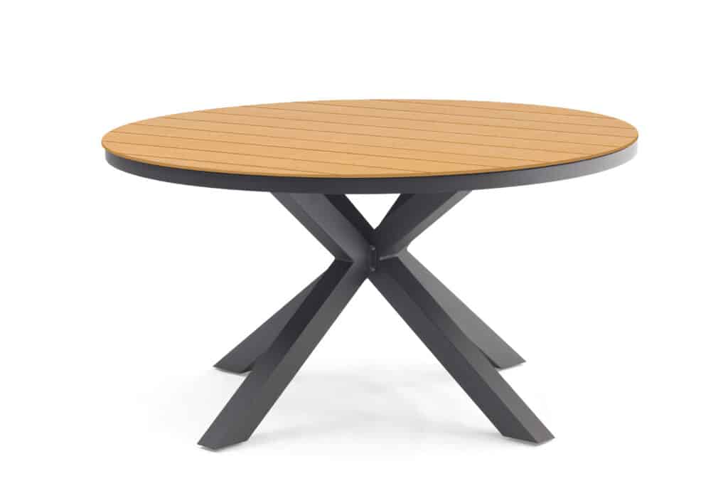 De ronde tuintafel Calgary 140cm Antraciet/Hout is het perfecte middelpunt voor gezellige momenten buiten. Met een diameter van 140cm biedt deze tafel voldoende plek aan minimaal 6 personen. Het warme houtlook tafelblad in combinatie met het strakke antraciete frame zorgt voor een moderne uitstraling. Met een hoogte van 75cm zit iedereen comfortabel aan tafel. Het grote voordeel van een ronde eettafel? Iedereen kan elkaar aankijken, waardoor gesprekken vanzelf gezelliger worden. Niemand zit aan het hoofd, wat de sfeer relaxt en uitnodigend maakt. Zonder hoeken loop je makkelijk om de tafel heen, handig als je gasten wilt bedienen.