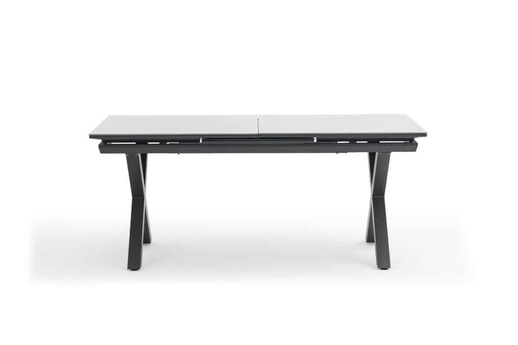 Het frame is gemaakt van gepoedercoat aluminium in een warme witte kleur. Dit materiaal is licht, roestvrij en blijft het hele jaar buiten staan. Het tafelblad van keramisch glas ziet er modern uit en is krasbestendig. Schoonmaken? Een sopje is genoeg. De robuuste X-poten geven extra stabiliteit en een strakke look. Dankzij de verstelbare poten staat de tuintafel altijd waterpas, ook op een oneffen terras.