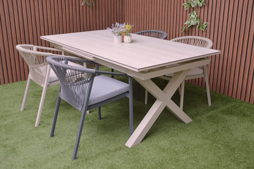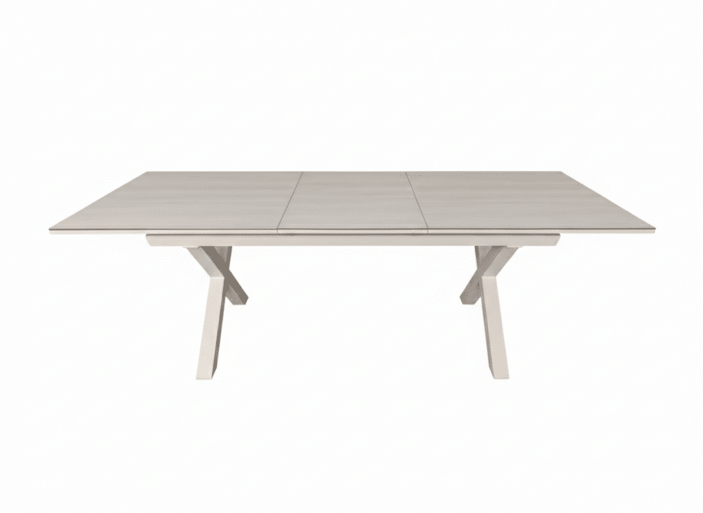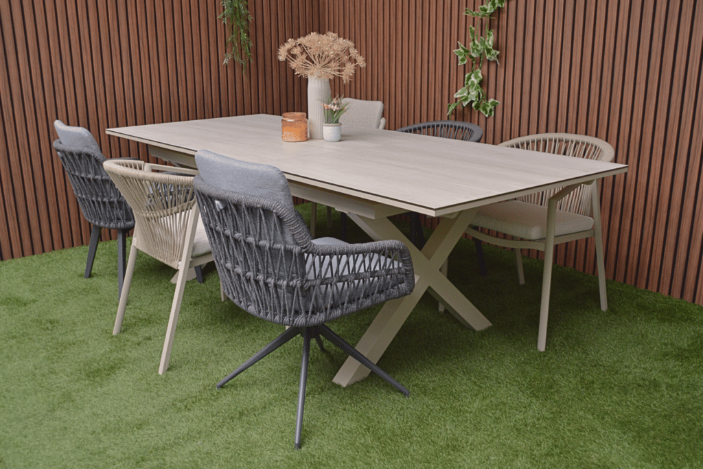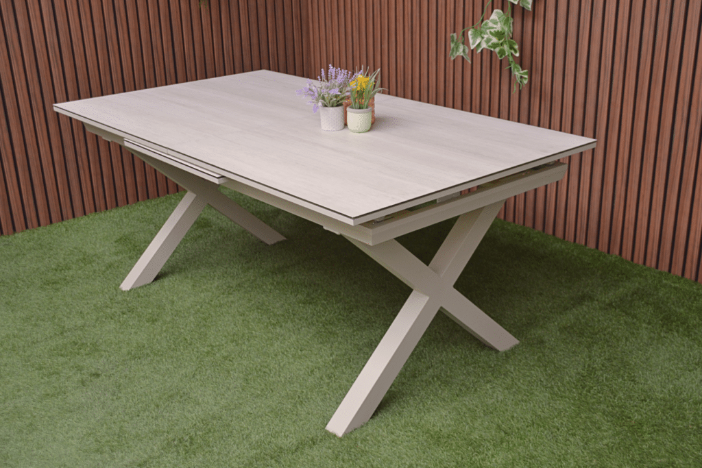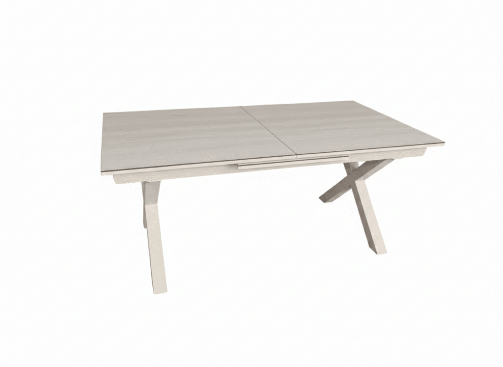 Het frame is gemaakt van gepoedercoat aluminium in een warme witte kleur. Dit materiaal is licht, roestvrij en blijft het hele jaar buiten staan. Het tafelblad van keramisch glas ziet er modern uit en is krasbestendig. Schoonmaken? Een sopje is genoeg. De robuuste X-poten geven extra stabiliteit en een strakke look. Dankzij de verstelbare poten staat de tuintafel altijd waterpas, ook op een oneffen terras.