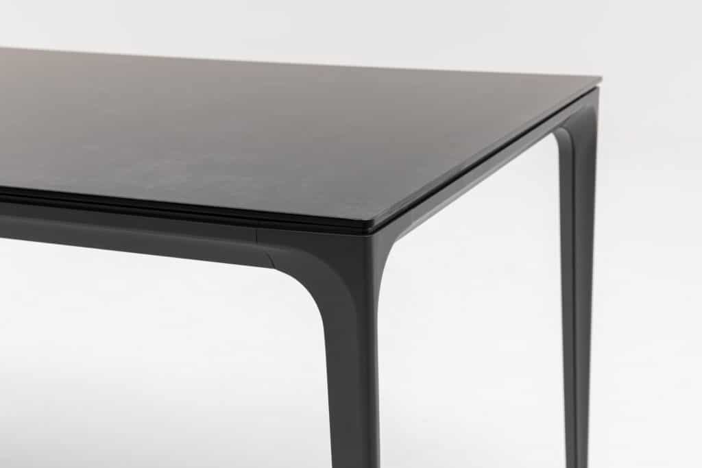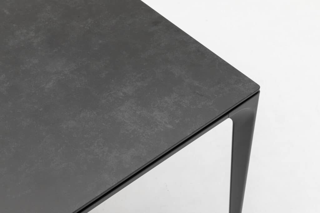 Deze dining tuintafel heeft een hoogte van 74cm en een vrije beenruimte van 68cm. Zo zit je altijd comfortabel, ook met een loungestoel. Het aluminium frame heeft een sterke poedercoating in antraciet. Deze beschermlaag roest niet en verkleurt niet. Het tafelblad is gemaakt van keramiek: een sterk materiaal dat krasbestendig is en makkelijk schoon te houden. De verstelbare poten zorgen ervoor dat de eettafel altijd stabiel staat, ook op een ongelijk terras.