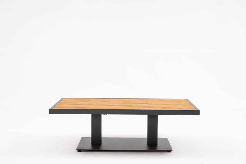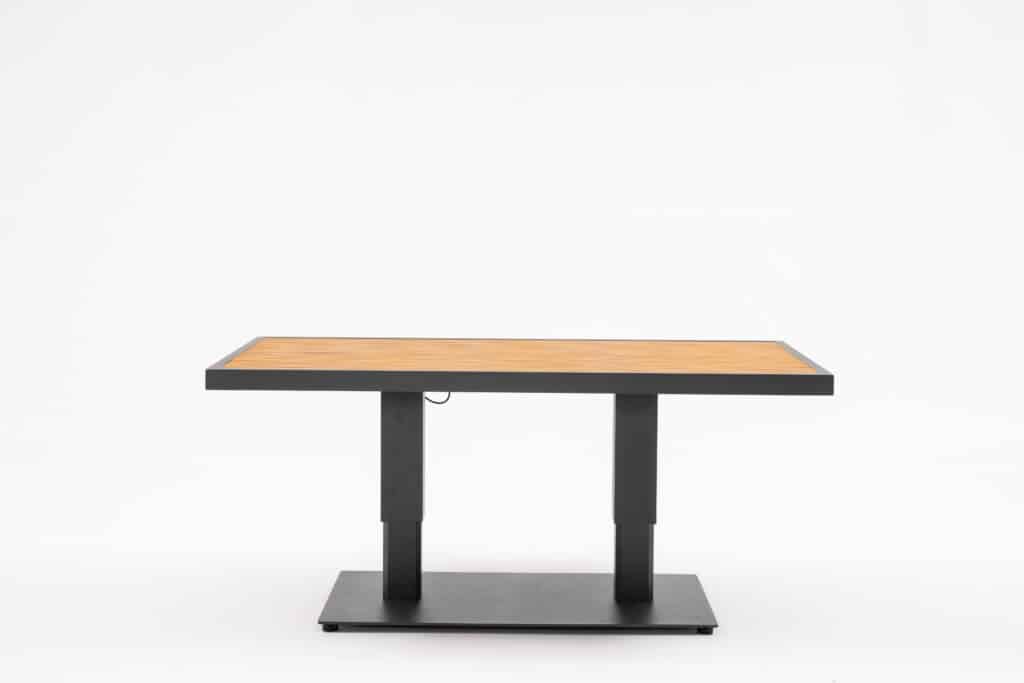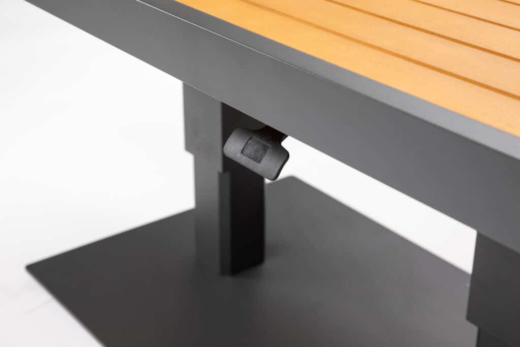 De tuintafel is voorzien van twee sterke gasveren waarmee je met één hendel gemakkelijk de hoogte aanpast. Zo wissel je moeiteloos van relaxen naar eten zonder gedoe. De stevige aluminium voetplaat van 100x60cm zorgt voor een stabiele basis in elke stand. Het frame kan het hele jaar buiten blijven staan zonder te roesten of te verkleuren. Een sopje is voldoende om de tafel schoon te houden. Het hout moet periodiek onderhouden worden met een bijpassende olie om de warme bruine kleur te behouden.